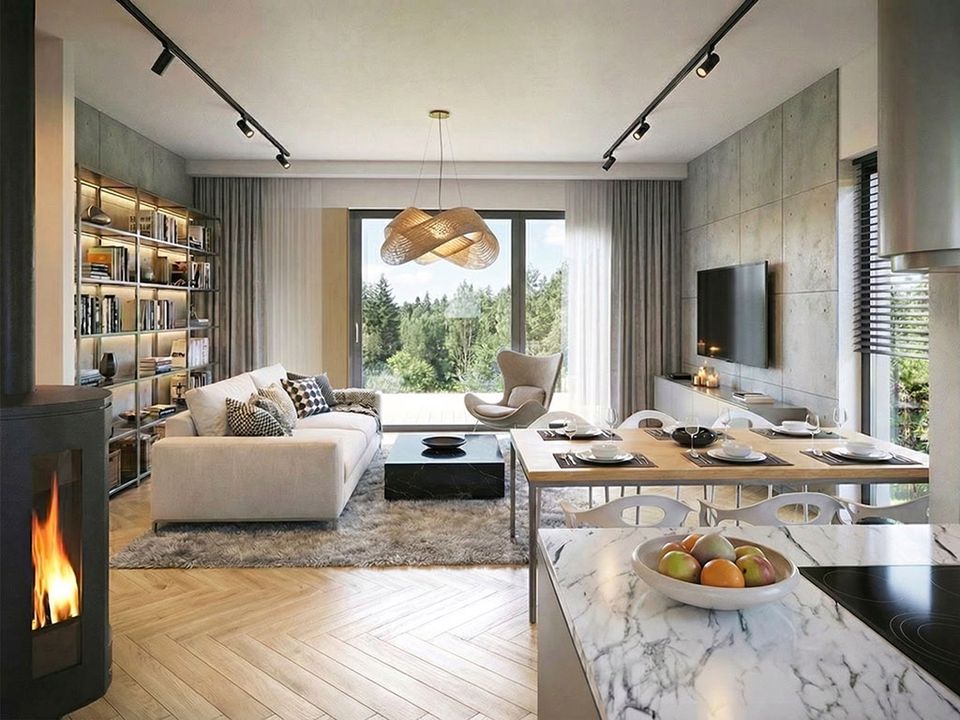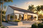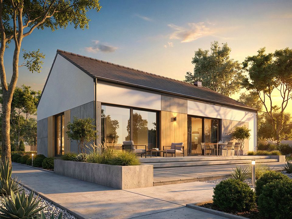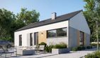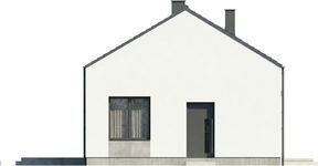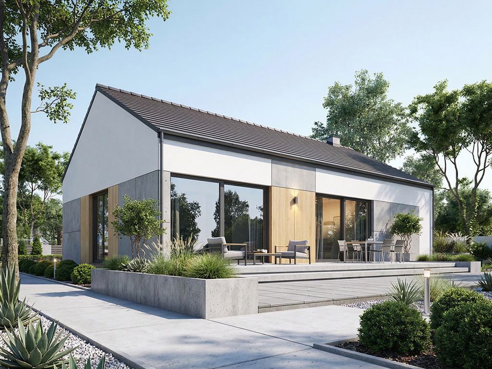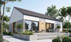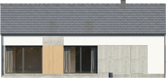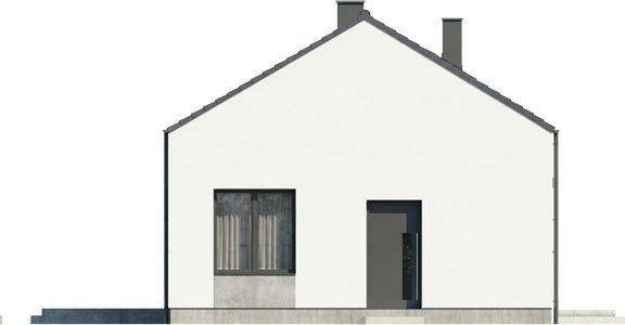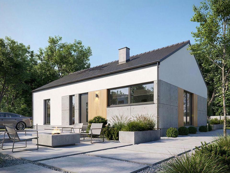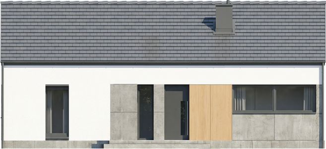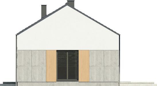Dom ma nowoczesną, minimalistyczną elewację łączącą biały tynk, płyty betonowe i drewniane akcenty przy wejściu, co nadaje mu elegancki, ponadczasowy charakter pasujący zarówno do zabudowy podmiejskiej, jak i wiejskiej. Zaprojektowano go w technologii tradycyjnej; z gazobetonu, na żelbetowych ławach fundamentowych, z drewnianą więźbą dachową i lekkim sufitem podwieszanym. Zastosowane rozwiązania zapewniają trwałość, dobrą izolacyjność cieplną oraz możliwość realizacji w standardzie energooszczędnym. Dwuspadowy dach o kącie 30° upraszcza konstrukcję, obniża koszty budowy, zwiększa odporność na warunki atmosferyczne i sprzyja dobrej izolacji termicznej.