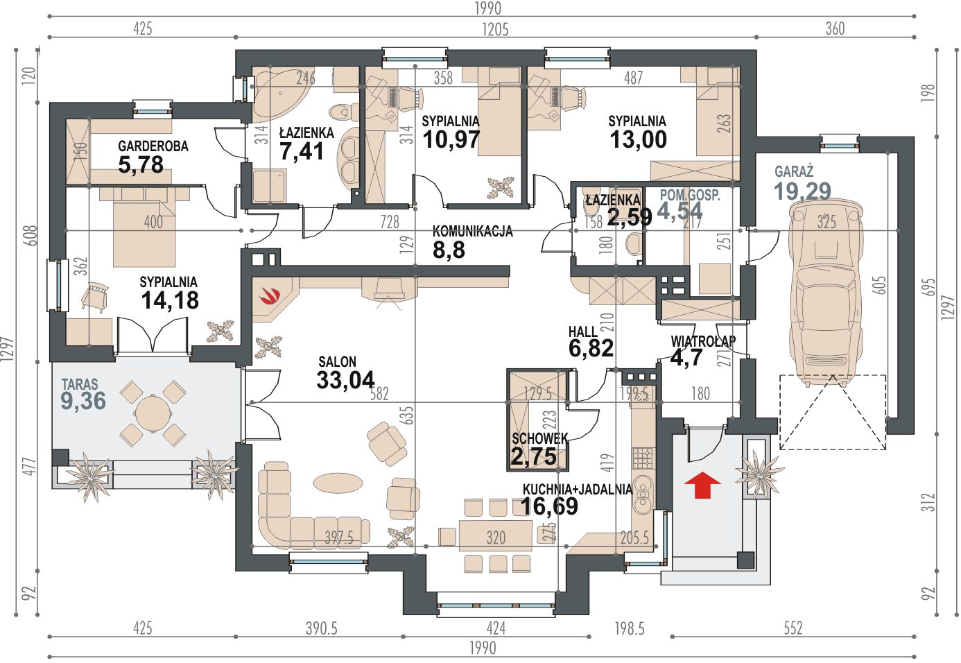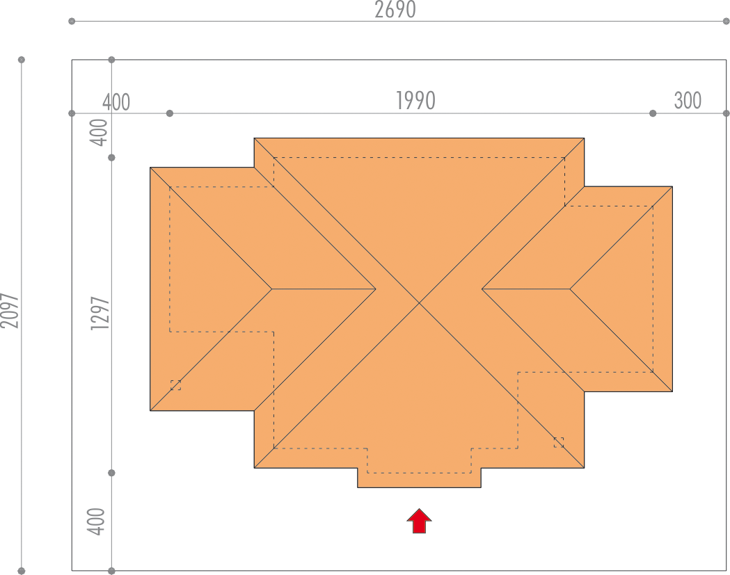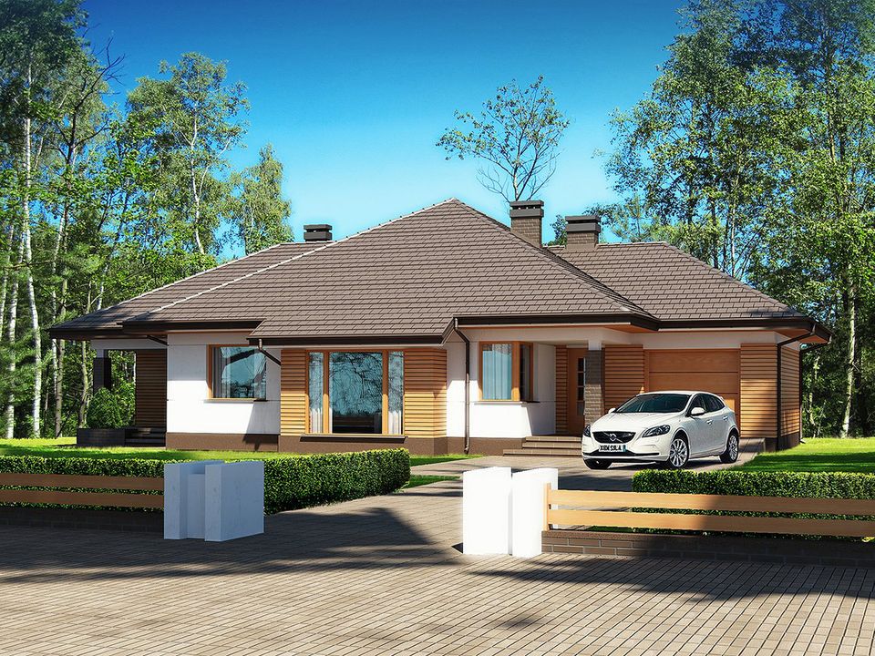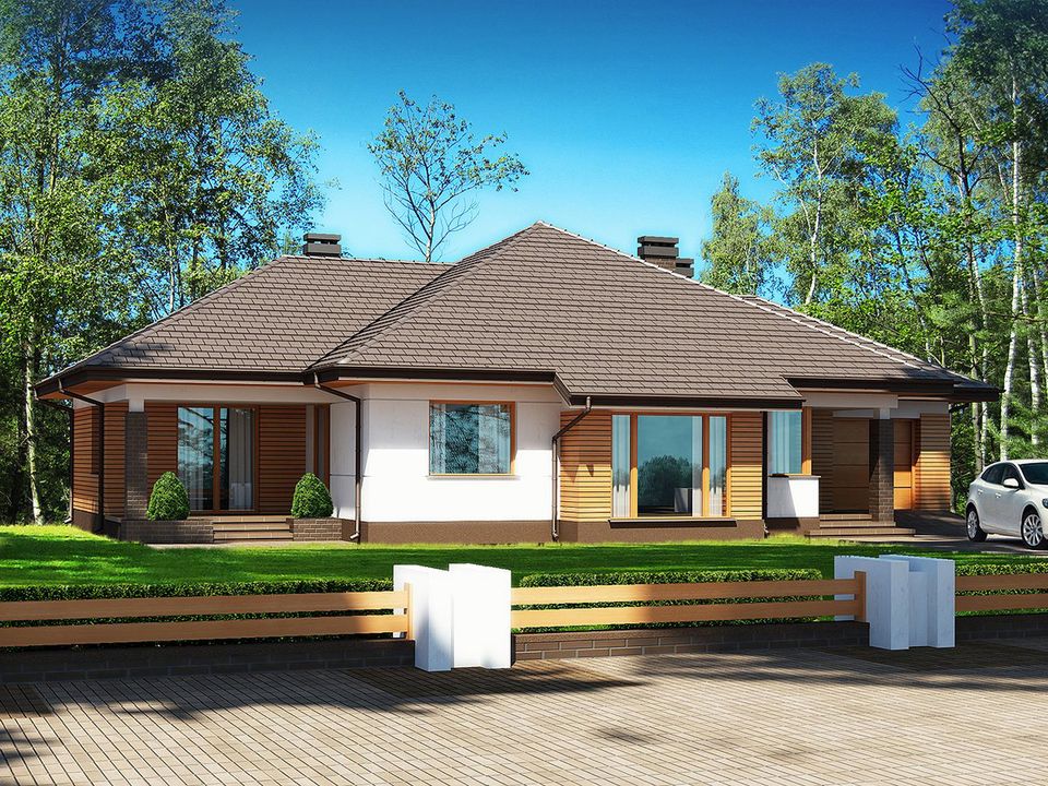 Graficzne opracowanie rzutów poglądowych widocznych na karcie projektu zostało wykonane przez Extradom.pl. Prezentowane przez Extradom.pl wizualizacje wykonane zostały przez autora projektu i należy poczytywać je jedynie za przykład i propozycję wykończenia, wizję architektoniczną autora projektu. Ostateczne wykończenie budynku może nastąpić na wiele sposobów. Szczegółowe rozwiązania zastosowane w oferowanej dokumentacji - w tym również ilość, lokalizacje i wygląd okien, drzwi, kominów - mogą w niewielkim stopniu różnić się od prezentowanej wizualizacji budynku.