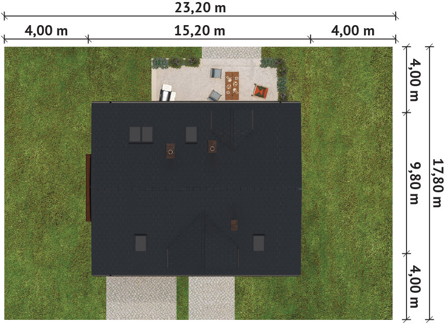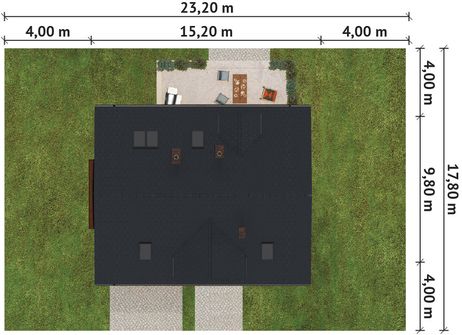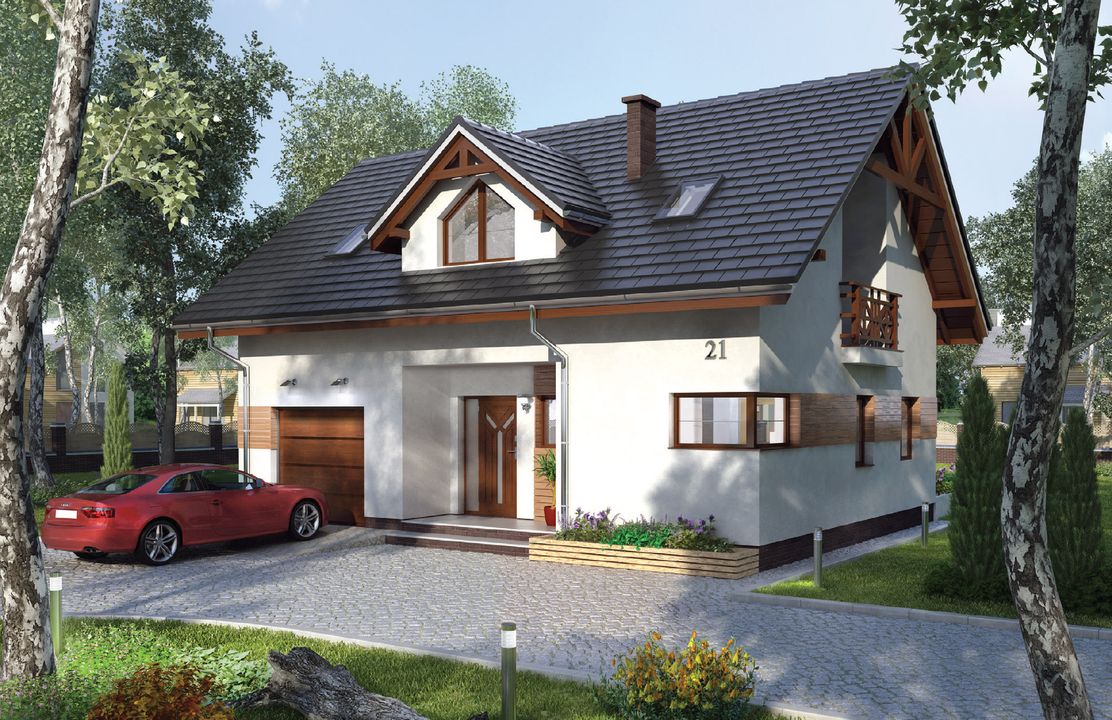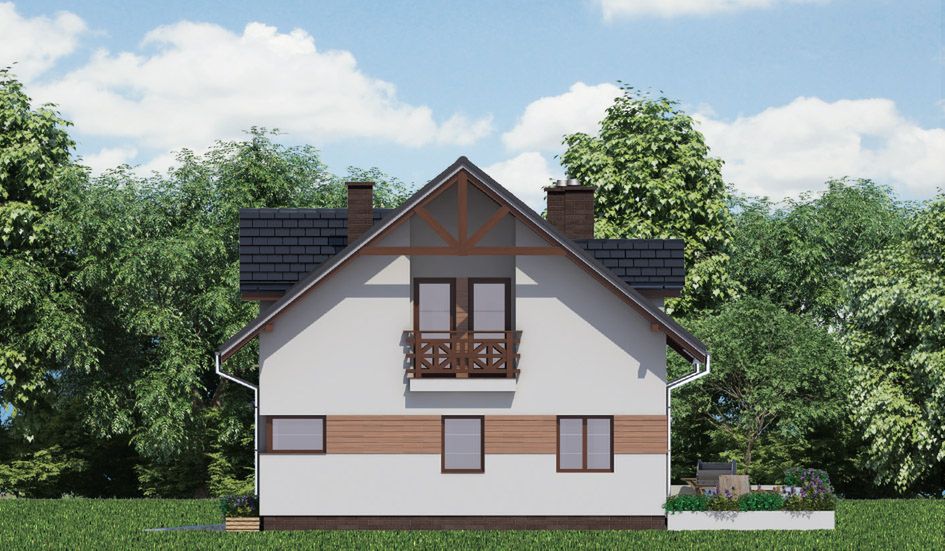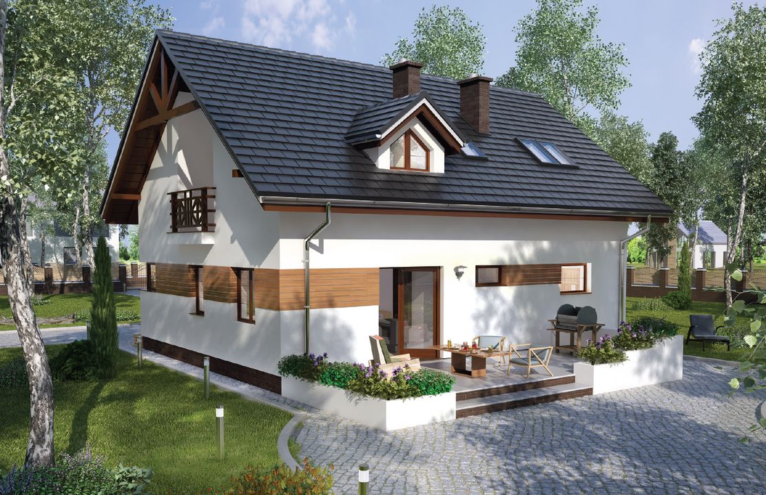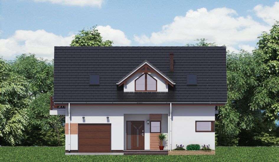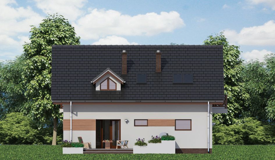 Graficzne opracowanie rzutów poglądowych widocznych na karcie projektu zostało wykonane przez Extradom.pl. Prezentowane przez Extradom.pl wizualizacje wykonane zostały przez autora projektu i należy poczytywać je jedynie za przykład i propozycję wykończenia, wizję architektoniczną autora projektu. Ostateczne wykończenie budynku może nastąpić na wiele sposobów. Szczegółowe rozwiązania zastosowane w oferowanej dokumentacji - w tym również ilość, lokalizacje i wygląd okien, drzwi, kominów - mogą w niewielkim stopniu różnić się od prezentowanej wizualizacji budynku.