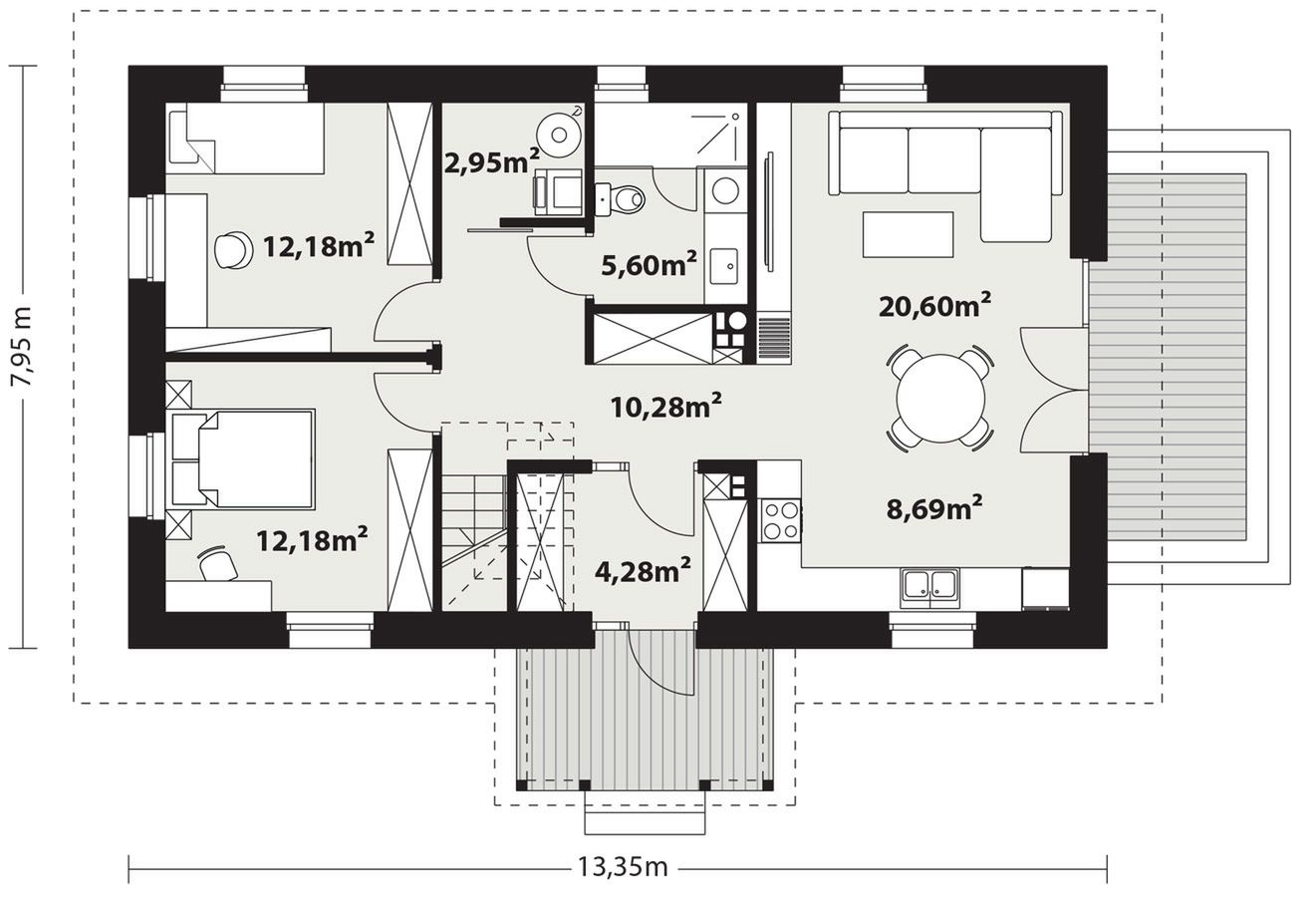 Dach: dachówka, blachodachówka lub blacha na rąbek; Elewacje: szalówka; Strop: drewniany; Ściany wewnętrzne: murowane; Ściany zewnętrzne: dwuwarstwowe, pustak ceramiczny, docieplony wełną mineralną;