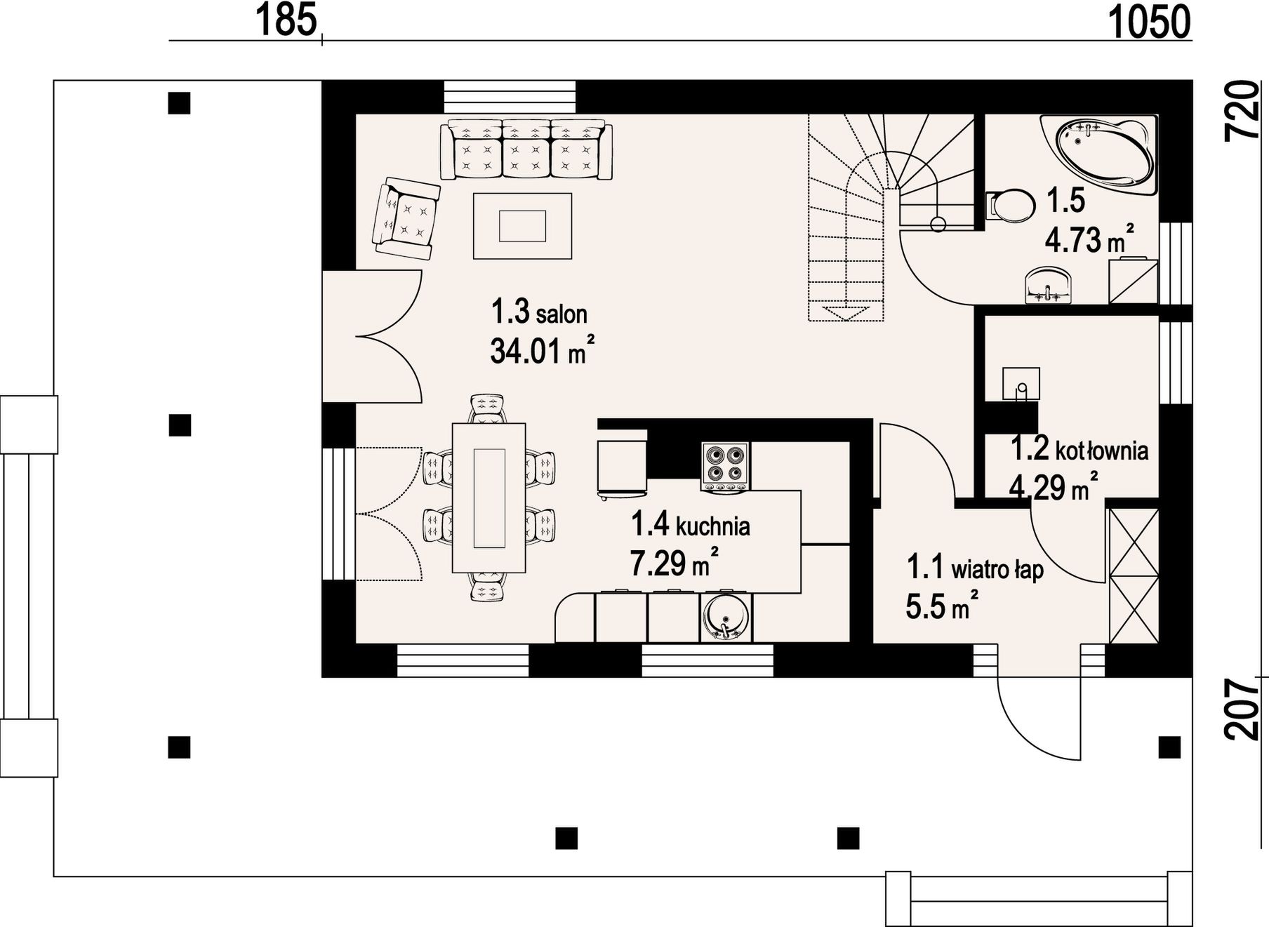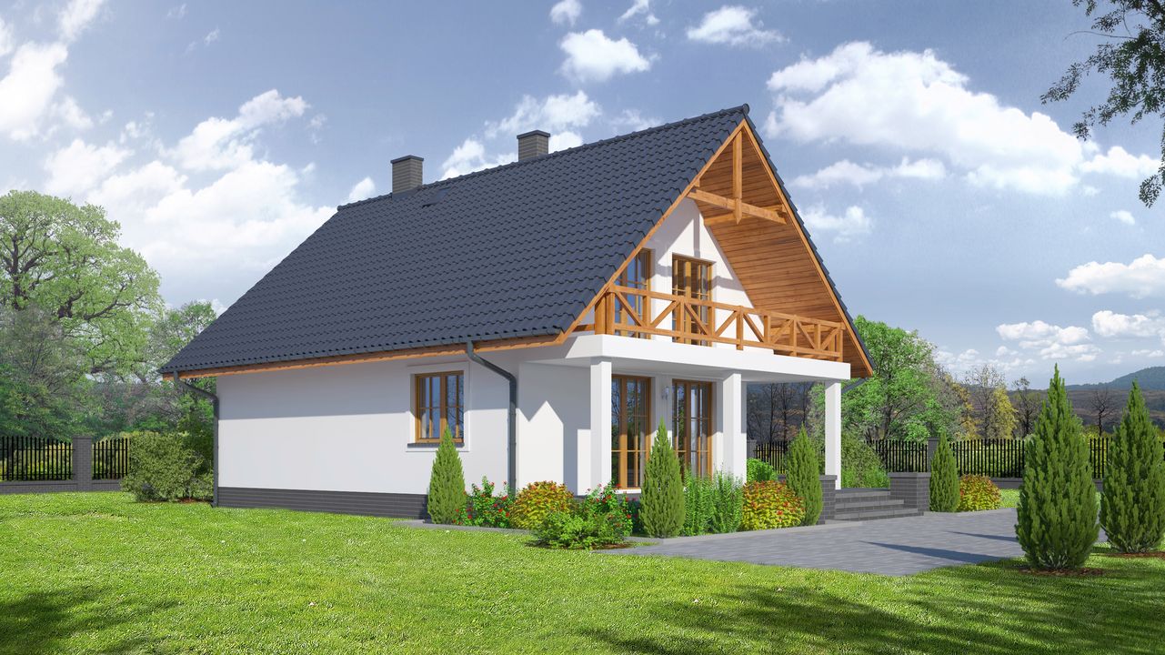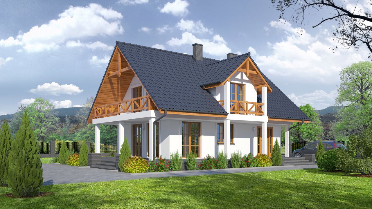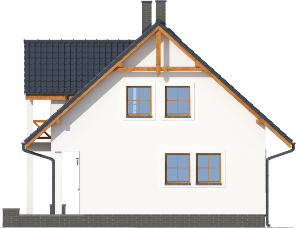 Graficzne opracowanie rzutów poglądowych widocznych na karcie projektu zostało wykonane przez Extradom.pl. Prezentowane przez Extradom.pl wizualizacje wykonane zostały przez autora projektu i należy poczytywać je jedynie za przykład i propozycję wykończenia, wizję architektoniczną autora projektu. Ostateczne wykończenie budynku może nastąpić na wiele sposobów. Szczegółowe rozwiązania zastosowane w oferowanej dokumentacji - w tym również ilość, lokalizacje i wygląd okien, drzwi, kominów - mogą w niewielkim stopniu różnić się od prezentowanej wizualizacji budynku.