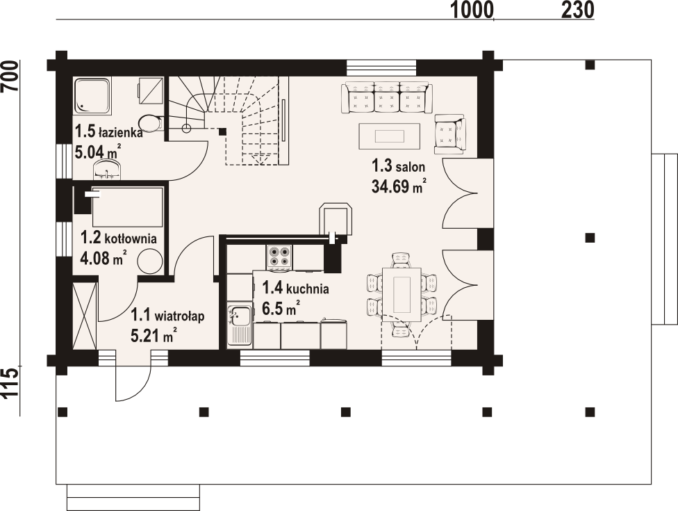Wysokość ścianki kolankowej: 1.02 m. Strop: drewniany. Pokrycie dachu: dachówka gontopodobna Gerard Corona. Ściany zewnętrzne: płazy drewniane + wełna mineralna + deska. Ściany wewnętrzne: płazy drewniane. Typ ogrzewania: kocioł gazowy lub kocioł na paliwo stałe. Instalacje dodatkowe: instalacja solarna.
