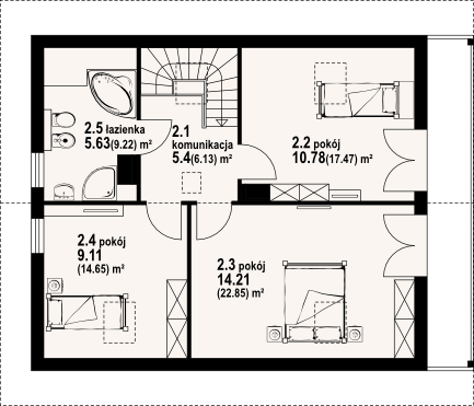 Wysokość ścianki kolankowej: 0.66 m. Strop: drewniany. Pokrycie dachu: blacho-dachówka. Ściany zewnętrzne: bloczki z betonu komórkowego + wełna mineralna; poddasze: szkielet drewniany. Ściany wewnętrzne: bloczki z betonu komórkowego/szkielet drewniany. Typ ogrzewania: kocioł gazowy lub kocioł na paliwo stałe. Inne: okna połaciowe Velux.