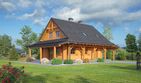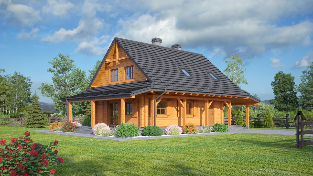 Wysokość ścianki kolankowej: 0.84 m. Strop: drewniany. Pokrycie dachu: dachówka gontopodobna Gerard Corona. Ściany zewnętrzne: płazy drewniane + wełna mineralna + deska. Ściany wewnętrzne: płazy drewniane. Typ ogrzewania: kocioł gazowy. Inne: okna połaciowe Velux.