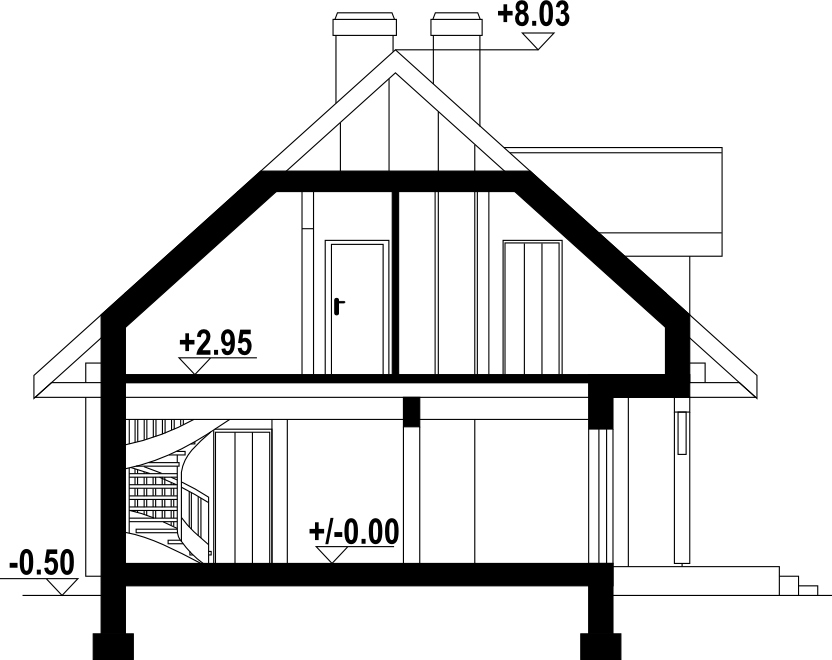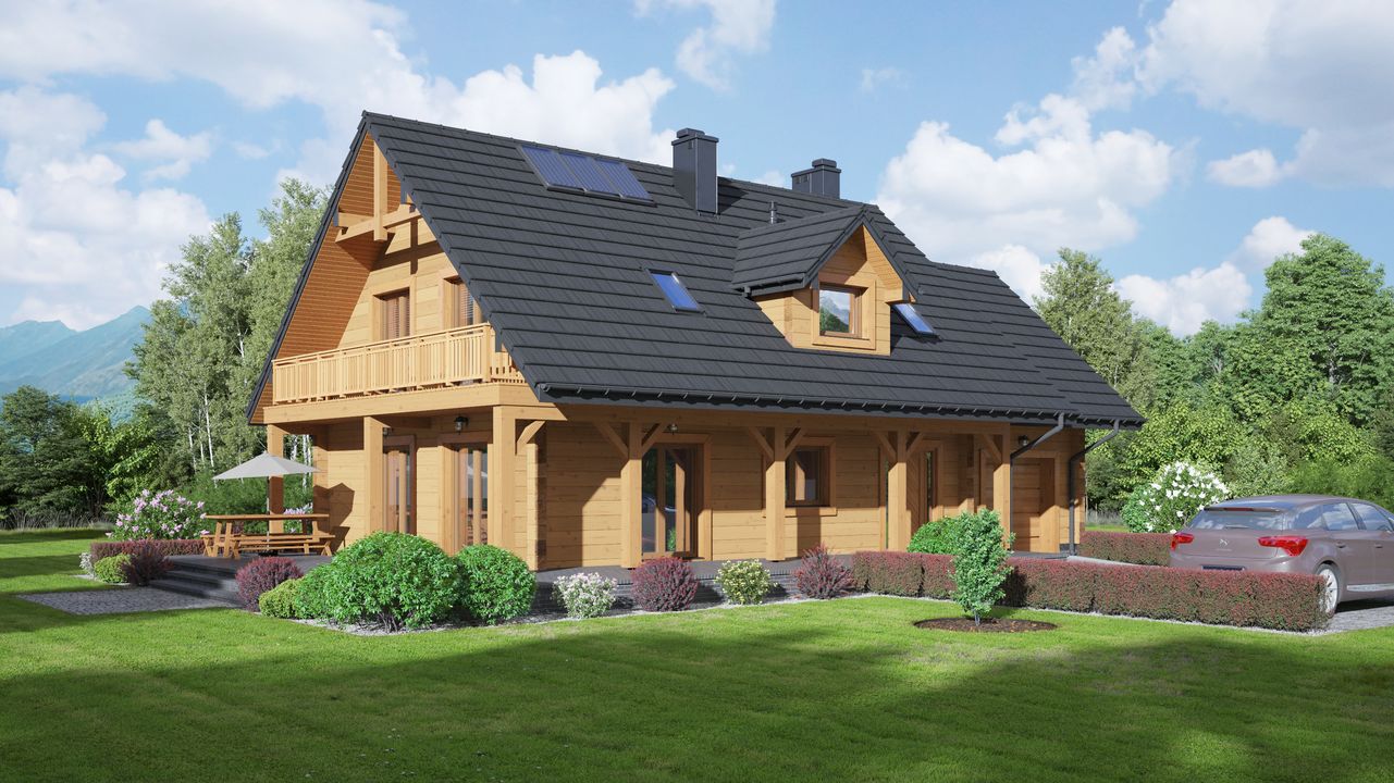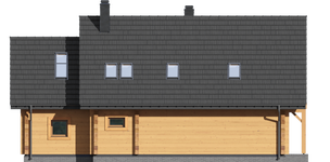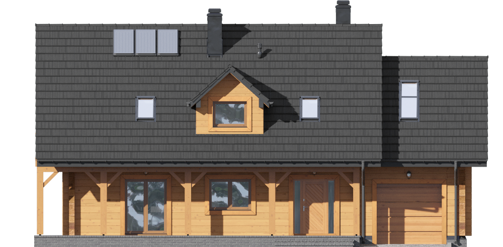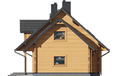 Wysokość ścianki kolankowej: 0.74 m. Strop: drewniany. Pokrycie dachu: dachówka gontopodobna Gerard Corona. Ściany zewnętrzne: płazy drewniane + wełna mineralna + deska. Ściany wewnętrzne: płazy drewniane. Typ ogrzewania: kocioł gazowy lub kocioł na paliwo stałe. Instalacje dodatkowe: instalacja solarna. Inne: brama garażowa Hörmann, okna połaciowe Velux.