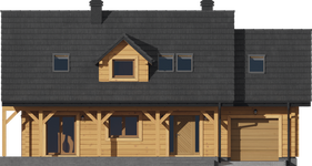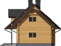 Wysokość ścianki kolankowej: 0.75 m. Ilość drewna na więźbę: 9.25 m³. Strop: drewniany. Pokrycie dachu: dachówka gontopodobna Gerard Corona. Ściany zewnętrzne: płazy drewniane + wełna mineralna + deska. Ściany wewnętrzne: płazy drewniane. Typ ogrzewania: kocioł gazowy lub kocioł na paliwo stałe. Instalacje dodatkowe: instalacja solarna. Inne: okna połaciowe Velux, brama garażowa Hörmann.