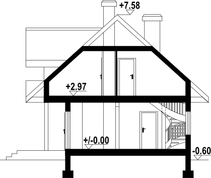 Wysokość ścianki kolankowej: 0.67 m. Strop: drewniany. Pokrycie dachu: dachówka gontopodobna Gerard Corona. Ściany zewnętrzne: szkieletowe drewniane ocieplone wełną mineralną. Ściany wewnętrzne: szkieletowe drewniane. Typ ogrzewania: kocioł gazowy lub kocioł na paliwo stałe.