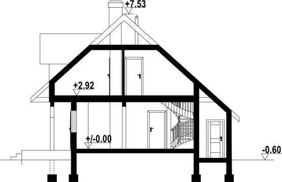 Wysokość ścianki kolankowej: 0.68 m. Strop: drewniany. Pokrycie dachu: dachówka gontopodobna Gerard Corona. Ściany zewnętrzne: szkieletowe drewniane ocieplone wełną mineralną. Ściany wewnętrzne: szkieletowe drewniane. Typ ogrzewania: pompa ciepła.