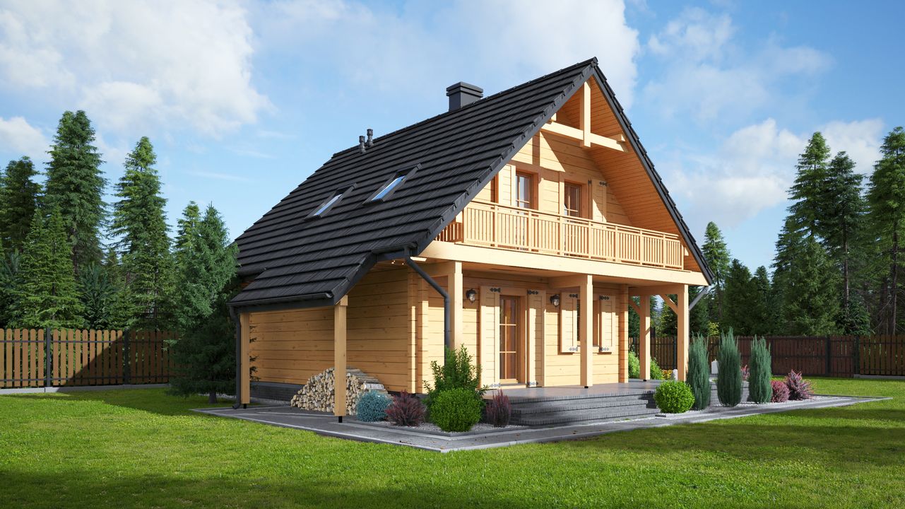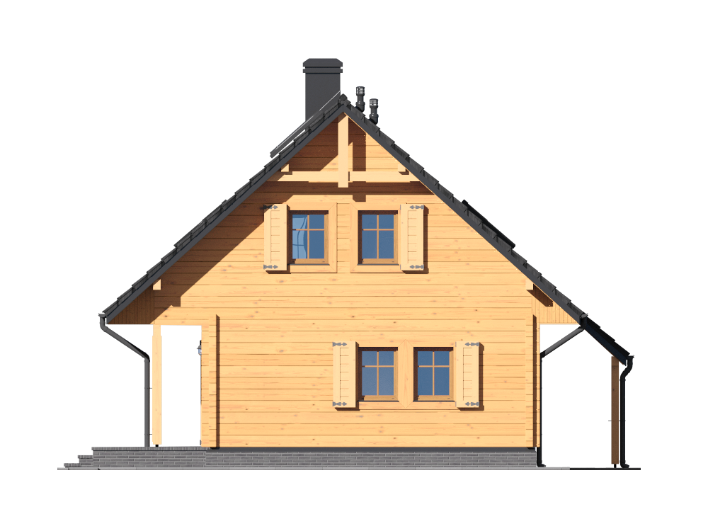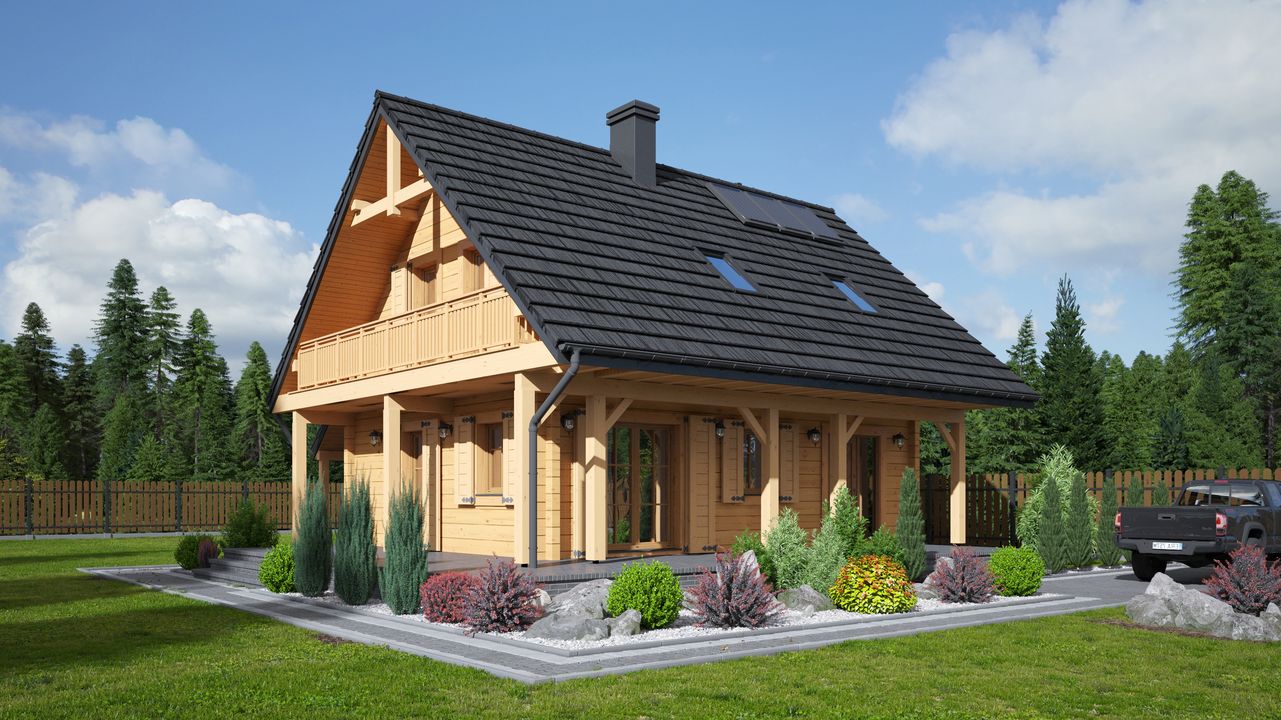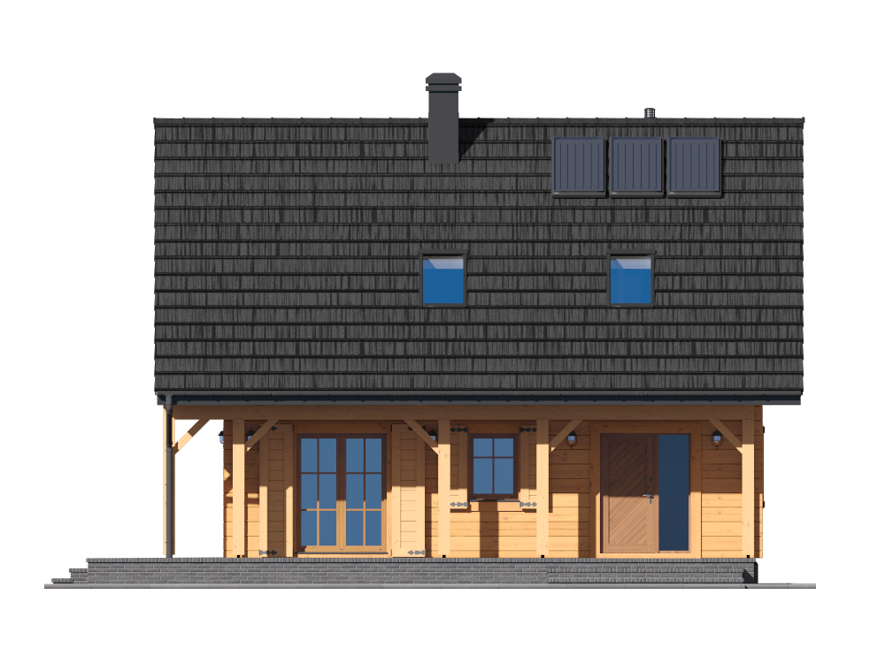 Wysokość ścianki kolankowej: 0.66 m. Ilość drewna na więźbę: 5.65 m³. Strop: drewniany. Pokrycie dachu: dachówka gontopodobna Gerard Corona. Ściany zewnętrzne: płazy drewniane + wełna mineralna + deska. Ściany wewnętrzne: płazy drewniane. Typ ogrzewania: elektryczne akumulacyjne + kominkowe. Instalacje dodatkowe: instalacja solarna. Inne: okna połaciowe Velux.