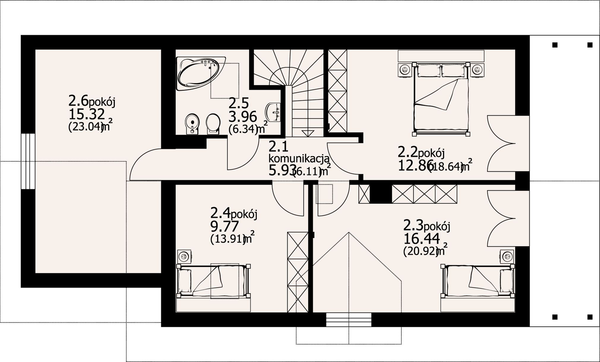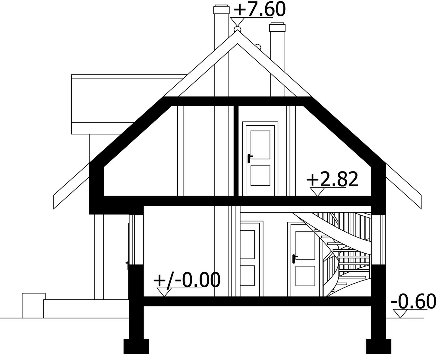 Wysokość ścianki kolankowej: 0.78 m. Strop: płyta żelbetowa. Pokrycie dachu: dachówka ceramiczna. Ściany zewnętrzne: pustaki ceramiczne + styropian. Ściany wewnętrzne: pustaki ceramiczne. Typ ogrzewania: kocioł gazowy lub kocioł na paliwo stałe. Inne: okna połaciowe Velux.