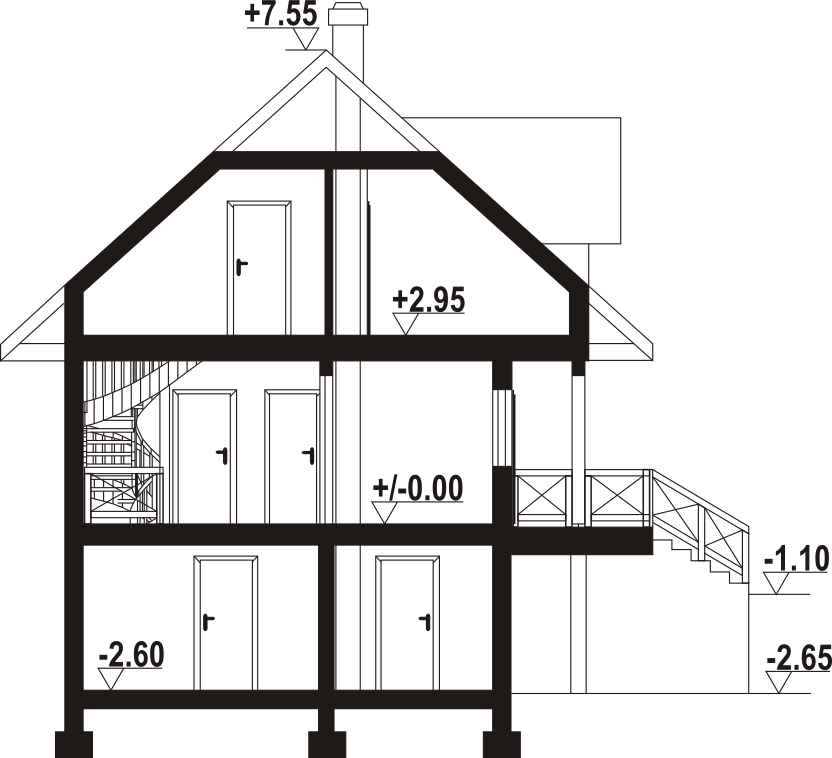 Wysokość ścianki kolankowej: 0.68 m. Strop: żelbet + drewniany. Pokrycie dachu: dachówka gontopodobna Gerard Corona. Ściany zewnętrzne: płazy drewniane + wełna mineralna + deska. Ściany wewnętrzne: szkieletowe drewniane. Typ ogrzewania: kocioł gazowy lub kocioł na paliwo stałe. Instalacje dodatkowe: instalacja wentylacji mech. z rekuperacją. Inne: okna połaciowe Velux.