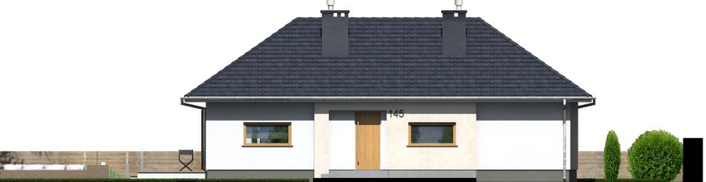 Graficzne opracowanie rzutów poglądowych widocznych na karcie projektu zostało wykonane przez Extradom.pl. Prezentowane przez Extradom.pl wizualizacje wykonane zostały przez autora projektu i należy poczytywać je jedynie za przykład i propozycję wykończenia, wizję architektoniczną autora projektu. Ostateczne wykończenie budynku może nastąpić na wiele sposobów. Szczegółowe rozwiązania zastosowane w oferowanej dokumentacji - w tym również ilość, lokalizacje i wygląd okien, drzwi, kominów - mogą w niewielkim stopniu różnić się od prezentowanej wizualizacji budynku.
