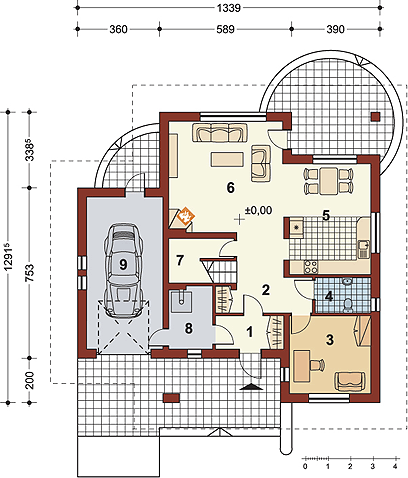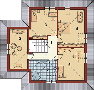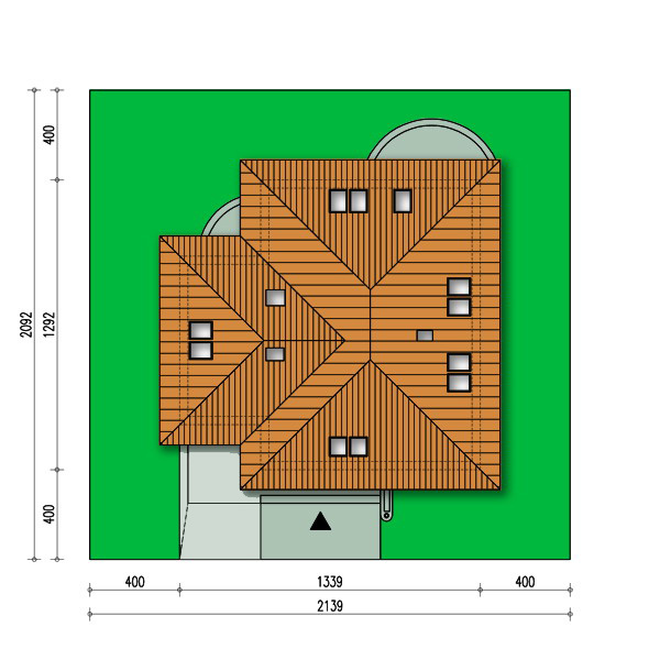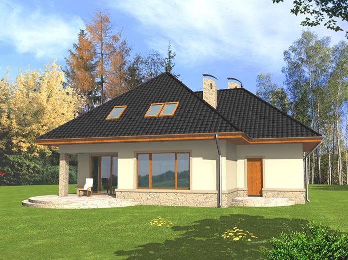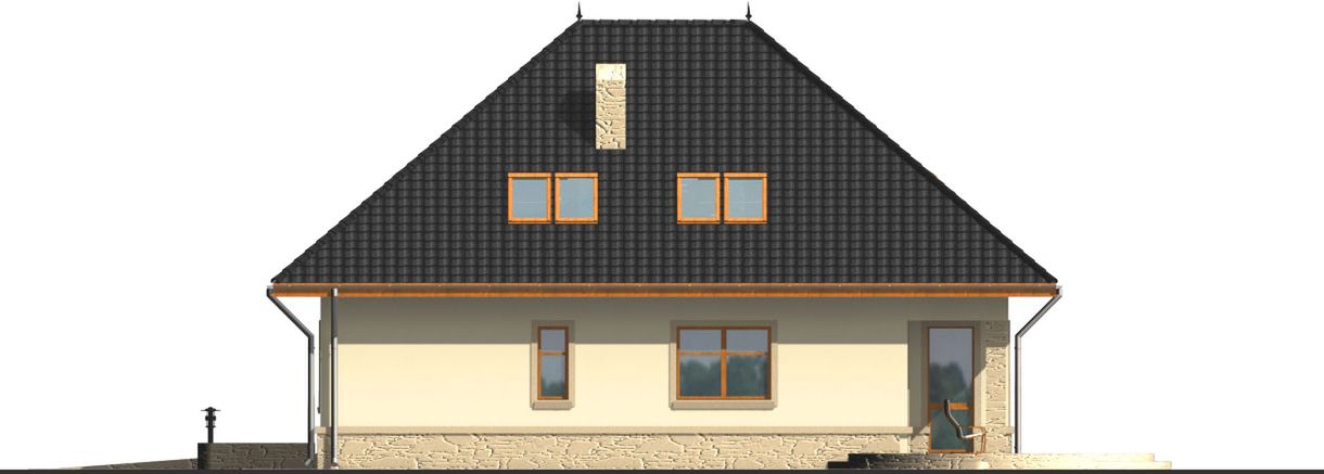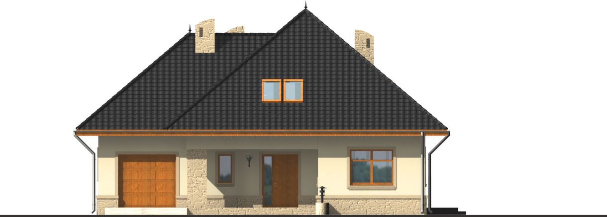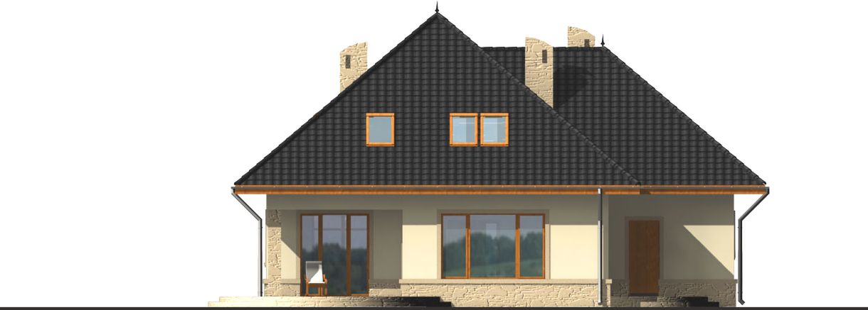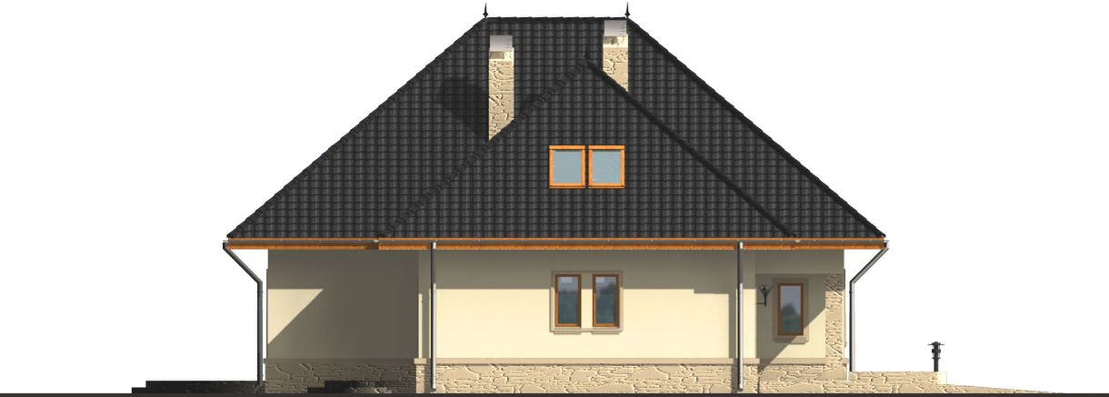 Graficzne opracowanie rzutów poglądowych widocznych na karcie projektu zostało wykonane przez Extradom.pl. Prezentowane przez Extradom.pl wizualizacje wykonane zostały przez autora projektu i należy poczytywać je jedynie za przykład i propozycję wykończenia, wizję architektoniczną autora projektu. Ostateczne wykończenie budynku może nastąpić na wiele sposobów. Szczegółowe rozwiązania zastosowane w oferowanej dokumentacji - w tym również ilość, lokalizacje i wygląd okien, drzwi, kominów - mogą w niewielkim stopniu różnić się od prezentowanej wizualizacji budynku.