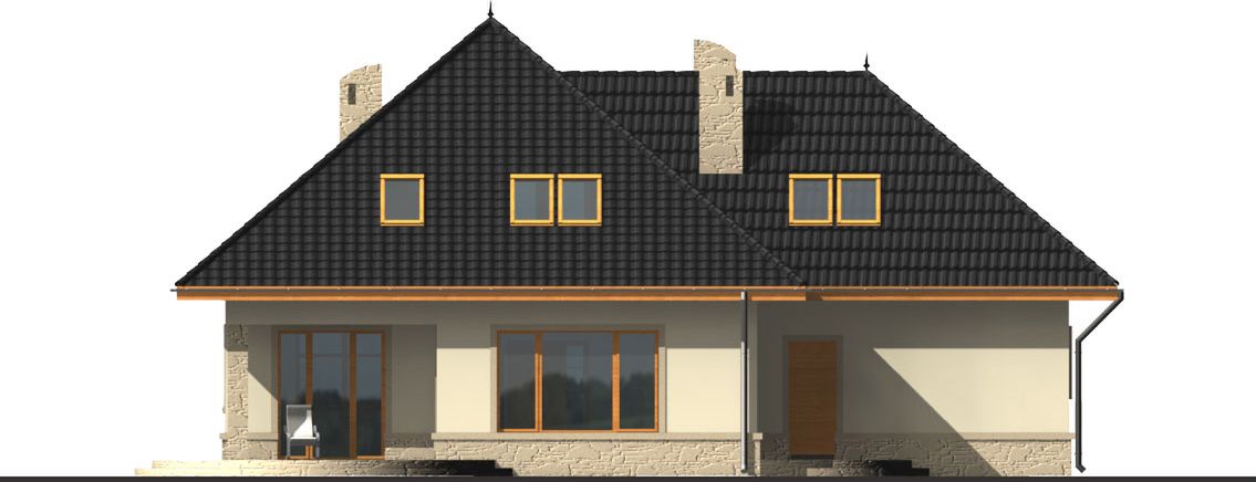 Graficzne opracowanie rzutów poglądowych widocznych na karcie projektu zostało wykonane przez Extradom.pl. Prezentowane przez Extradom.pl wizualizacje wykonane zostały przez autora projektu i należy poczytywać je jedynie za przykład i propozycję wykończenia, wizję architektoniczną autora projektu. Ostateczne wykończenie budynku może nastąpić na wiele sposobów. Szczegółowe rozwiązania zastosowane w oferowanej dokumentacji - w tym również ilość, lokalizacje i wygląd okien, drzwi, kominów - mogą w niewielkim stopniu różnić się od prezentowanej wizualizacji budynku.