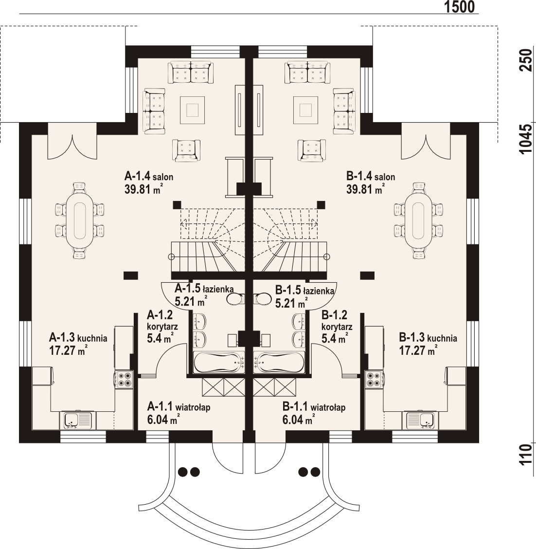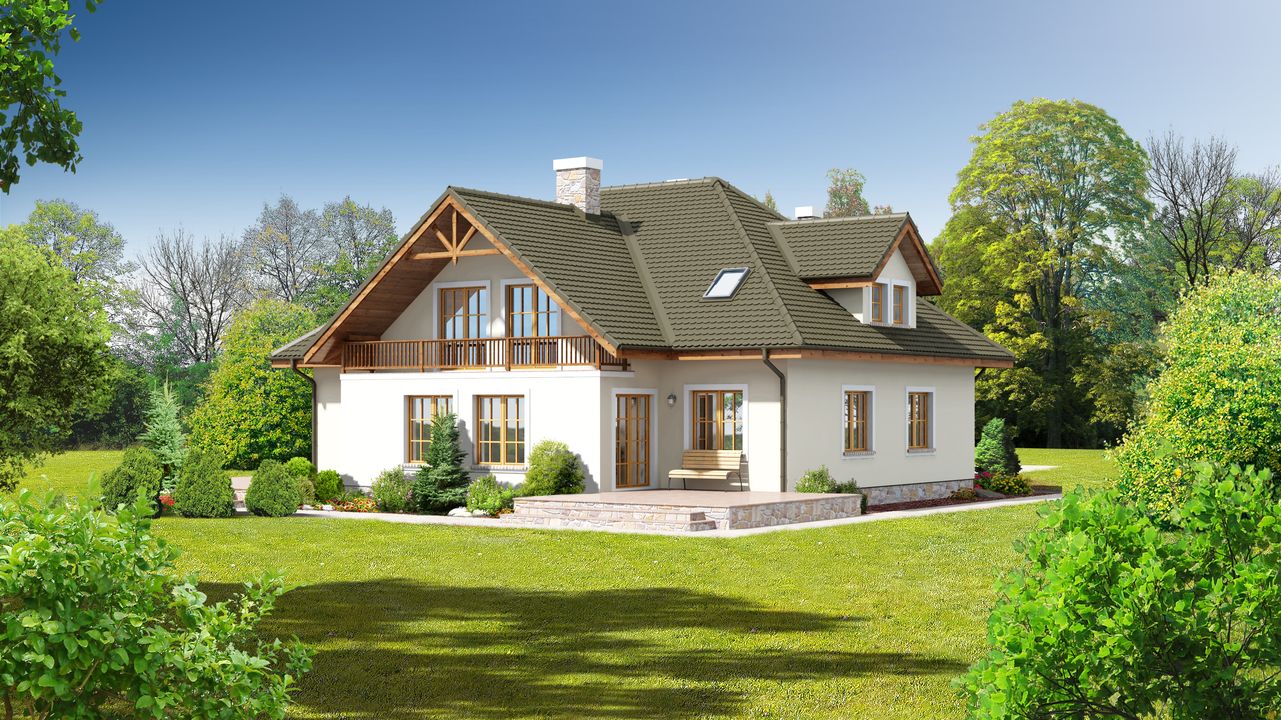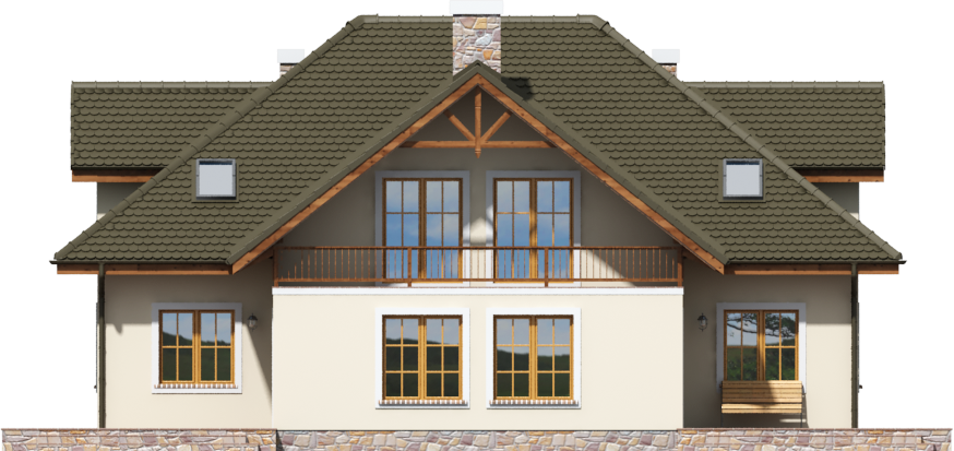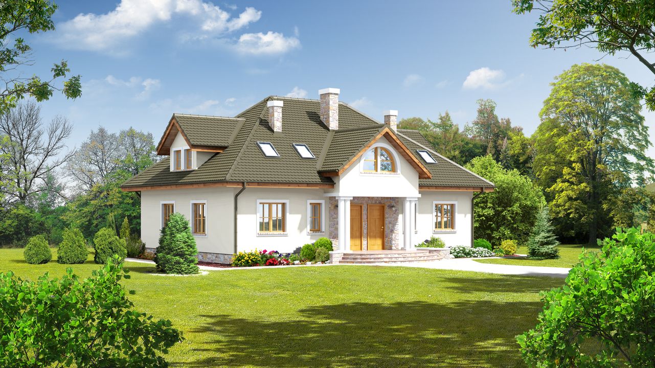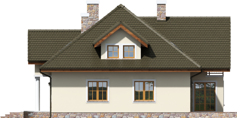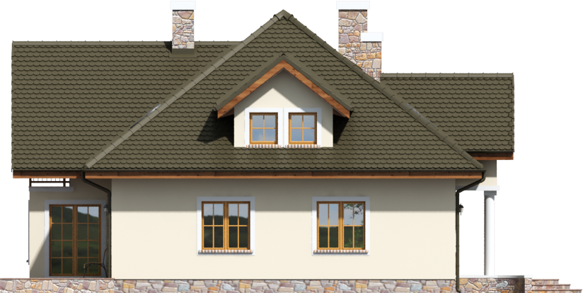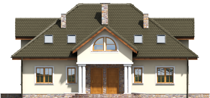 Graficzne opracowanie rzutów poglądowych widocznych na karcie projektu zostało wykonane przez Extradom.pl. Prezentowane przez Extradom.pl wizualizacje wykonane zostały przez autora projektu i należy poczytywać je jedynie za przykład i propozycję wykończenia, wizję architektoniczną autora projektu. Ostateczne wykończenie budynku może nastąpić na wiele sposobów. Szczegółowe rozwiązania zastosowane w oferowanej dokumentacji - w tym również ilość, lokalizacje i wygląd okien, drzwi, kominów - mogą w niewielkim stopniu różnić się od prezentowanej wizualizacji budynku.