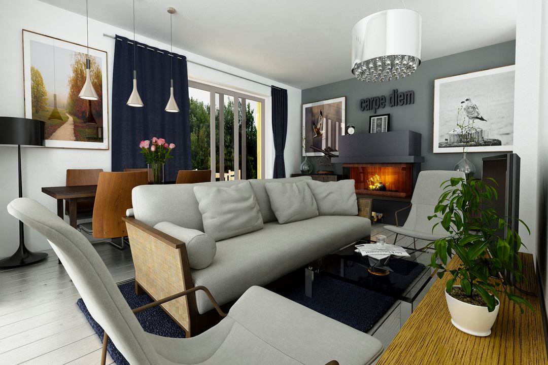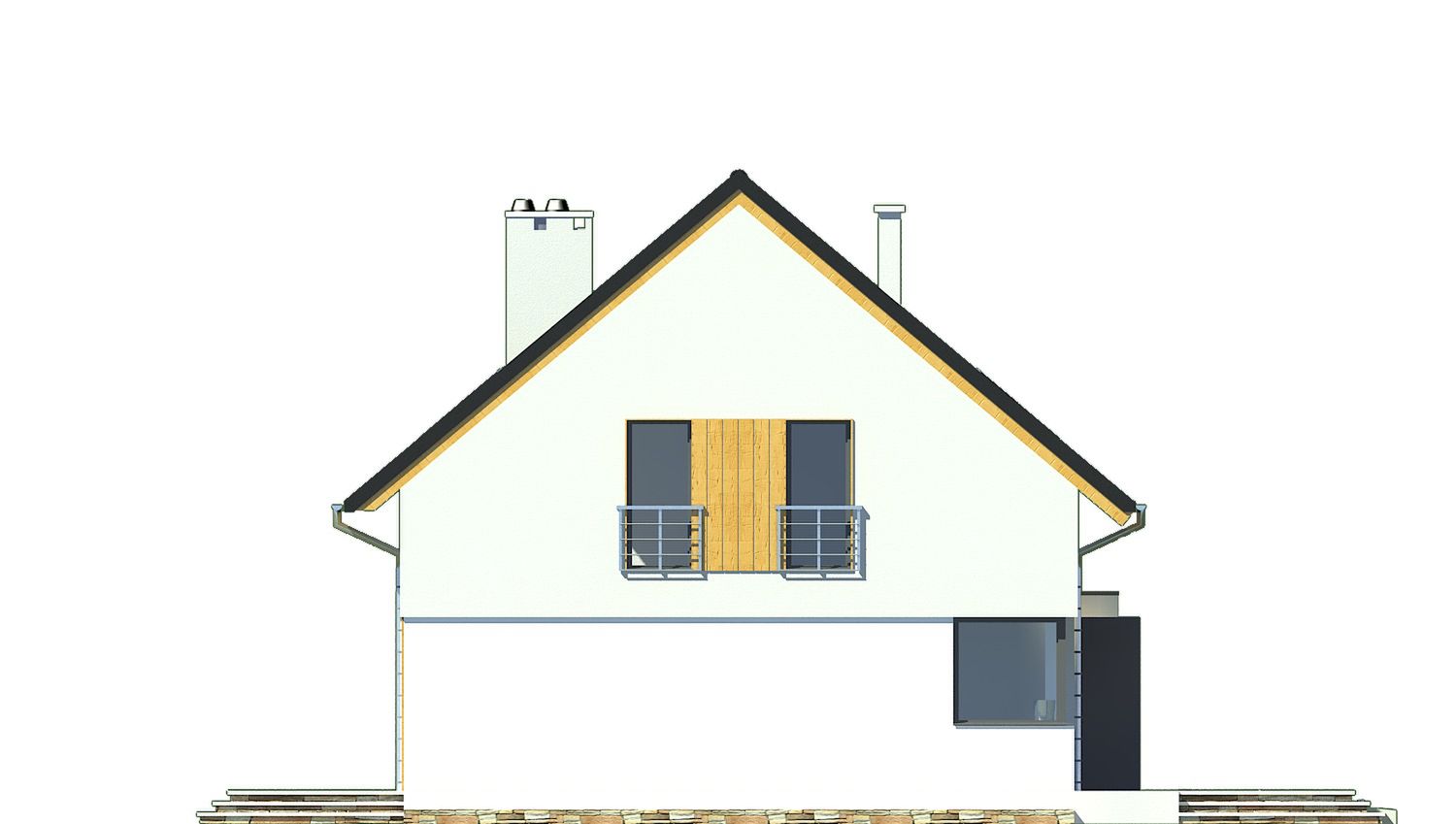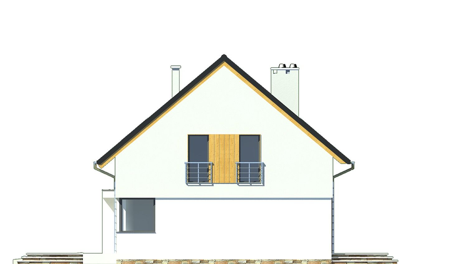 Graficzne opracowanie rzutów poglądowych widocznych na karcie projektu zostało wykonane przez Extradom.pl. Prezentowane przez Extradom.pl wizualizacje wykonane zostały przez autora projektu i należy poczytywać je jedynie za przykład i propozycję wykończenia, wizję architektoniczną autora projektu. Ostateczne wykończenie budynku może nastąpić na wiele sposobów. Szczegółowe rozwiązania zastosowane w oferowanej dokumentacji - w tym również ilość, lokalizacje i wygląd okien, drzwi, kominów - mogą w niewielkim stopniu różnić się od prezentowanej wizualizacji budynku.