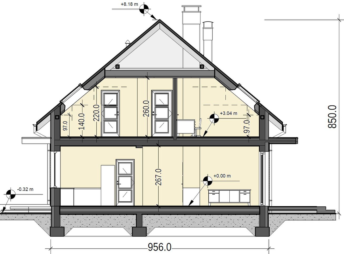 Posadowienie bezpośrednie na zbrojonych ławach i stopach fundamentowych wykonanych z betonu B 20. Ściany fundamentowe: murowane z bloczków betonowych M6. Ściany zewnętrzne: bloczki gazobetonowe gr. 25cm na zaprawie systemowej, ciepłochronnej, ocieplony styropianem fasadowym gr. 15cm. Do ocieplenia budynku zaprojektowano użycie styropianu grafitowego gr. 15 cm, o współczynniku „lambda” nie przekraczającym 0,035 W(mK) i „oporze cieplnym” nie mniejszym niż Rd – 4,0 m2k/W. Zastosowanie materiałów budowlanych (ocieplenie ścian, dachu, podłogi na gruncie, okien i drzwi zewnętrznych) użytych w projekcie odpowiada nowym wymaganiom obowiązującym od stycznia 2021 roku (WT2021). Ściany nośne wewnętrzne: bloczki gazobetonowe gr. 25cm na zaprawie cementowo-wapiennej lub systemowej. Ściany wewnętrzne działowe: bloczki gazobetonowe gr. 12cm. Strop gęstożebrowy z wypełnieniem pustakami betonowymi, zalewany wraz z wieńcami betonem B 20. Konstrukcja dachu: drewniana, drewno klasy C24, więźba dachowa krokwiowo-jętkowa. Budynek, w wersji podstawowej, jest zaprojektowany z pomieszczeniem kotłowni wyposażonej w kocioł ekologiczny na paliwo stałe „pellet” i spełnia wszystkie wymagania dotyczące WT2021. Na etapie adaptacji projektu jest możliwość zaprojektowania ogrzewania gazowego ze wspomaganiem instalacją solarną lub ogrzewania nowoczesną pompa ciepła typu powietrze – woda. Projekt pod względem konstrukcyjnym spełnia normy zgodne z Eurokodami.