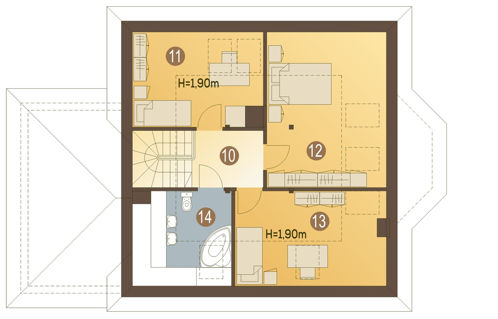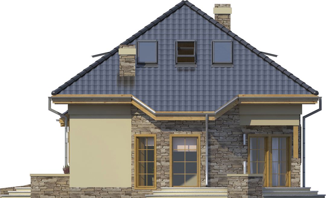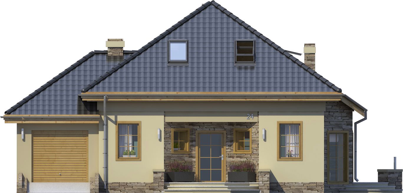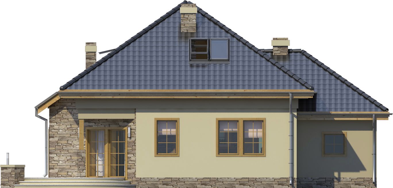 Graficzne opracowanie rzutów poglądowych widocznych na karcie projektu zostało wykonane przez Extradom.pl. Prezentowane przez Extradom.pl wizualizacje wykonane zostały przez autora projektu i należy poczytywać je jedynie za przykład i propozycję wykończenia, wizję architektoniczną autora projektu. Ostateczne wykończenie budynku może nastąpić na wiele sposobów. Szczegółowe rozwiązania zastosowane w oferowanej dokumentacji - w tym również ilość, lokalizacje i wygląd okien, drzwi, kominów - mogą w niewielkim stopniu różnić się od prezentowanej wizualizacji budynku.