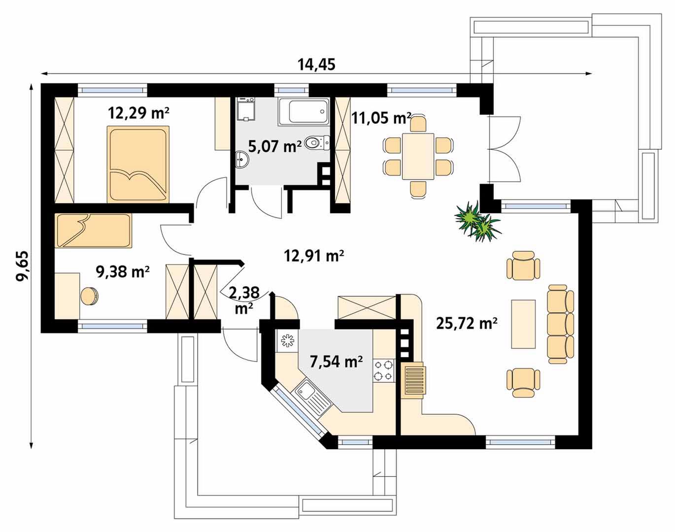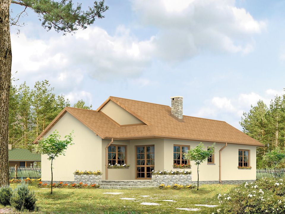 Graficzne opracowanie rzutów poglądowych widocznych na karcie projektu zostało wykonane przez Extradom.pl. Prezentowane przez Extradom.pl wizualizacje wykonane zostały przez autora projektu i należy poczytywać je jedynie za przykład i propozycję wykończenia, wizję architektoniczną autora projektu. Ostateczne wykończenie budynku może nastąpić na wiele sposobów. Szczegółowe rozwiązania zastosowane w oferowanej dokumentacji - w tym również ilość, lokalizacje i wygląd okien, drzwi, kominów - mogą w niewielkim stopniu różnić się od prezentowanej wizualizacji budynku.