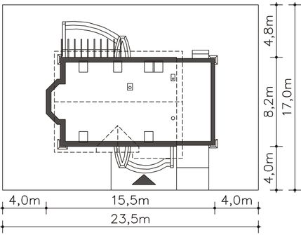 Graficzne opracowanie rzutów poglądowych widocznych na karcie projektu zostało wykonane przez Extradom.pl. Prezentowane przez Extradom.pl wizualizacje wykonane zostały przez autora projektu i należy poczytywać je jedynie za przykład i propozycję wykończenia, wizję architektoniczną autora projektu. Ostateczne wykończenie budynku może nastąpić na wiele sposobów. Szczegółowe rozwiązania zastosowane w oferowanej dokumentacji - w tym również ilość, lokalizacje i wygląd okien, drzwi, kominów - mogą w niewielkim stopniu różnić się od prezentowanej wizualizacji budynku.
