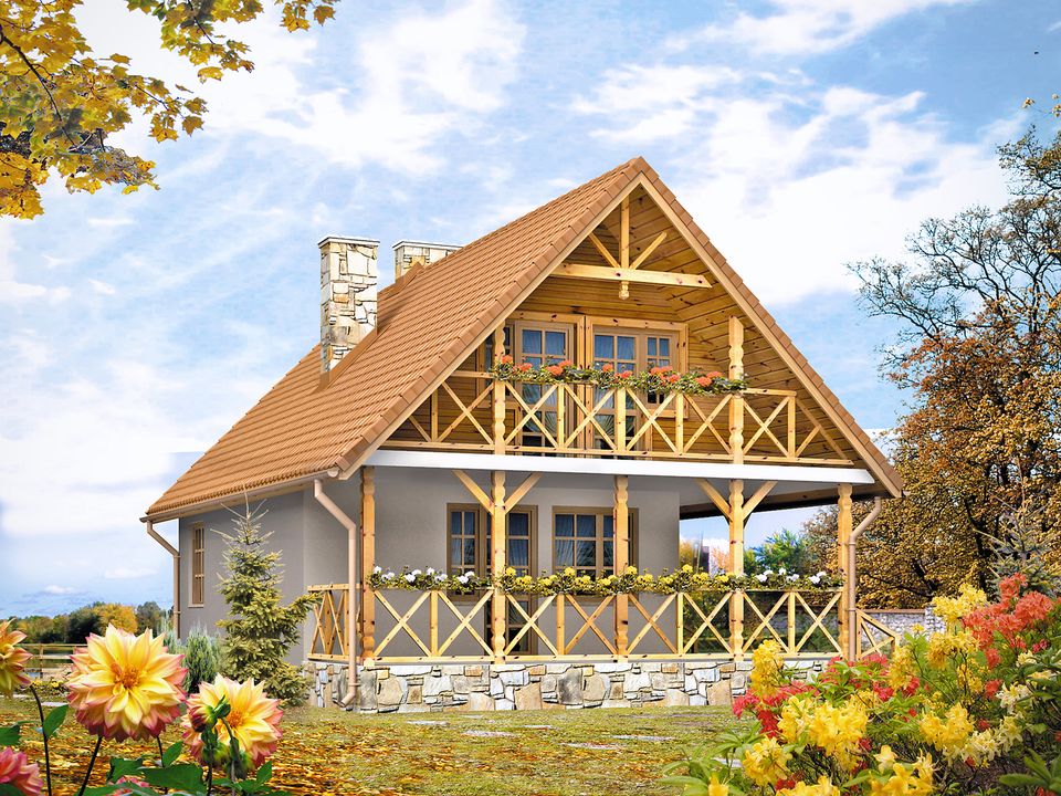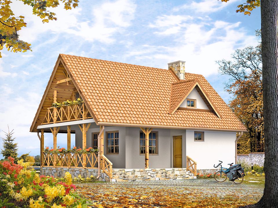 Graficzne opracowanie rzutów poglądowych widocznych na karcie projektu zostało wykonane przez Extradom.pl. Prezentowane przez Extradom.pl wizualizacje wykonane zostały przez autora projektu i należy poczytywać je jedynie za przykład i propozycję wykończenia, wizję architektoniczną autora projektu. Ostateczne wykończenie budynku może nastąpić na wiele sposobów. Szczegółowe rozwiązania zastosowane w oferowanej dokumentacji - w tym również ilość, lokalizacje i wygląd okien, drzwi, kominów - mogą w niewielkim stopniu różnić się od prezentowanej wizualizacji budynku.