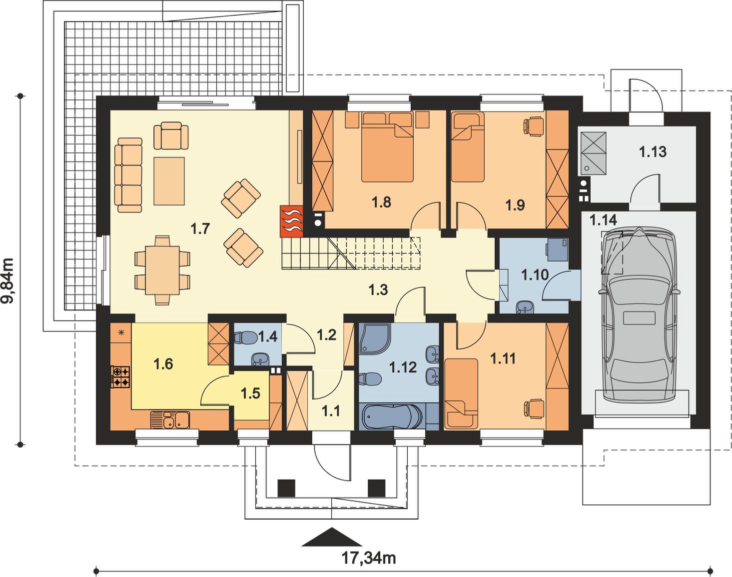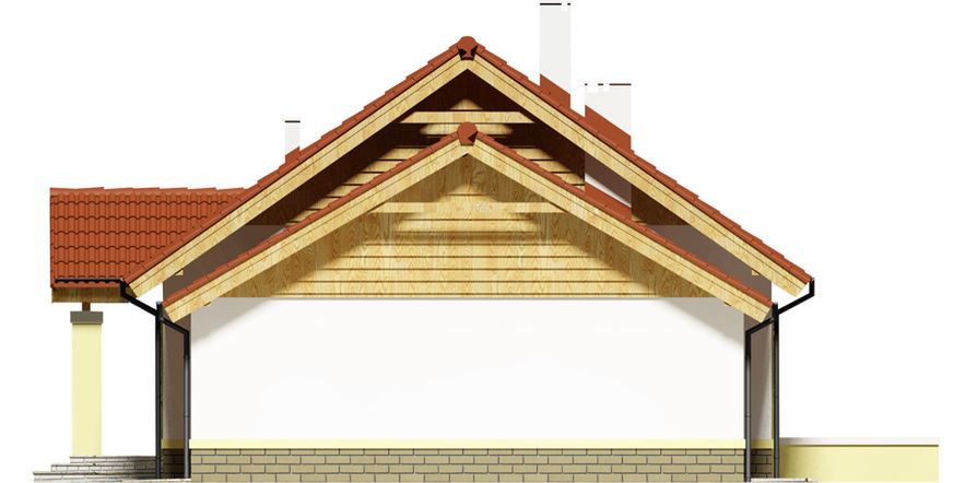 Graficzne opracowanie rzutów poglądowych widocznych na karcie projektu zostało wykonane przez Extradom.pl. Prezentowane przez Extradom.pl wizualizacje wykonane zostały przez autora projektu i należy poczytywać je jedynie za przykład i propozycję wykończenia, wizję architektoniczną autora projektu. Ostateczne wykończenie budynku może nastąpić na wiele sposobów. Szczegółowe rozwiązania zastosowane w oferowanej dokumentacji - w tym również ilość, lokalizacje i wygląd okien, drzwi, kominów - mogą w niewielkim stopniu różnić się od prezentowanej wizualizacji budynku.