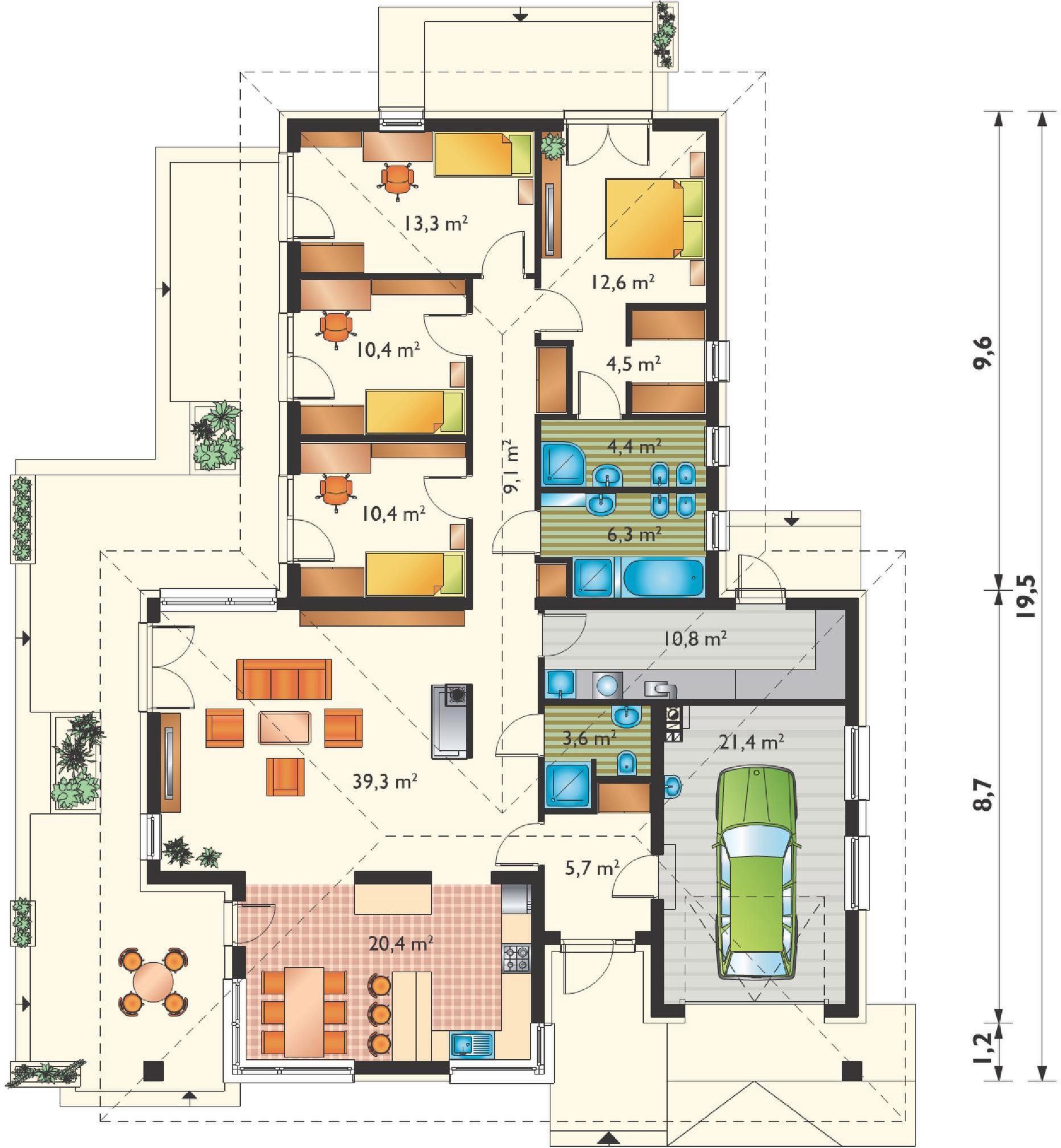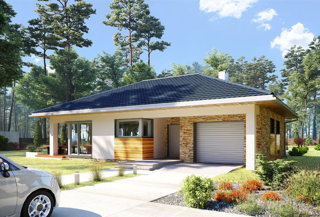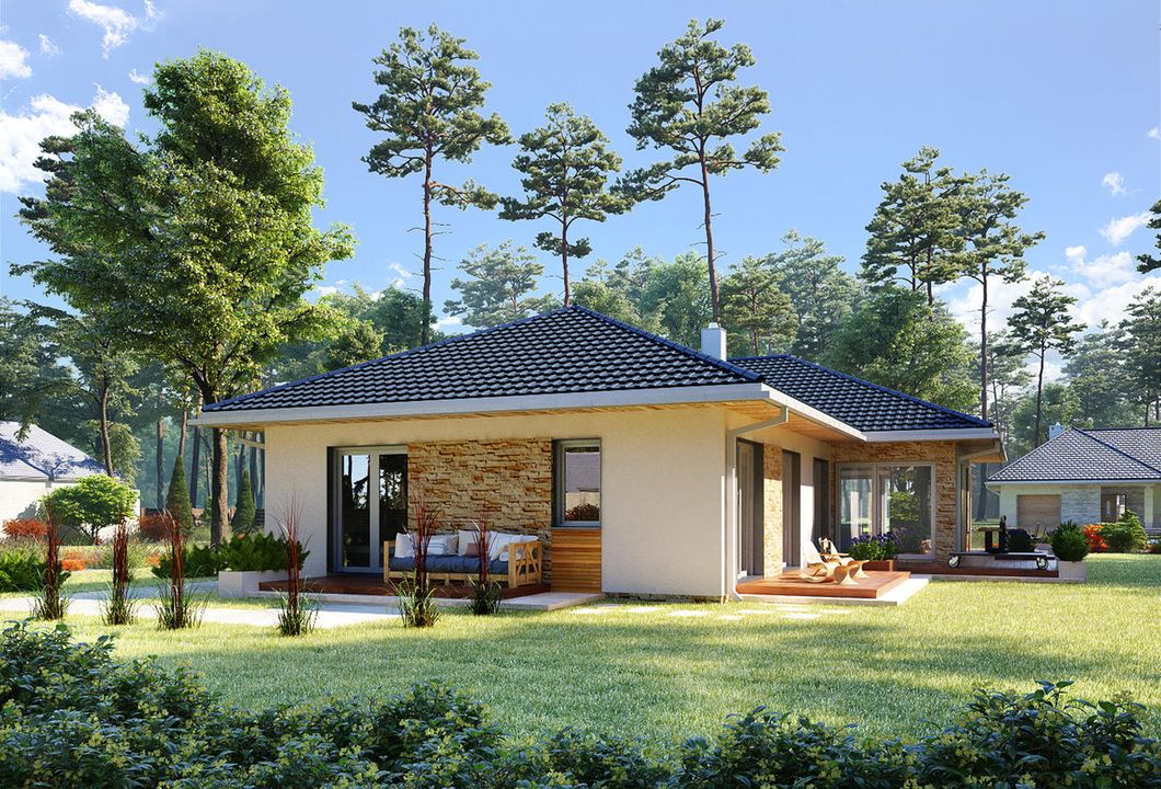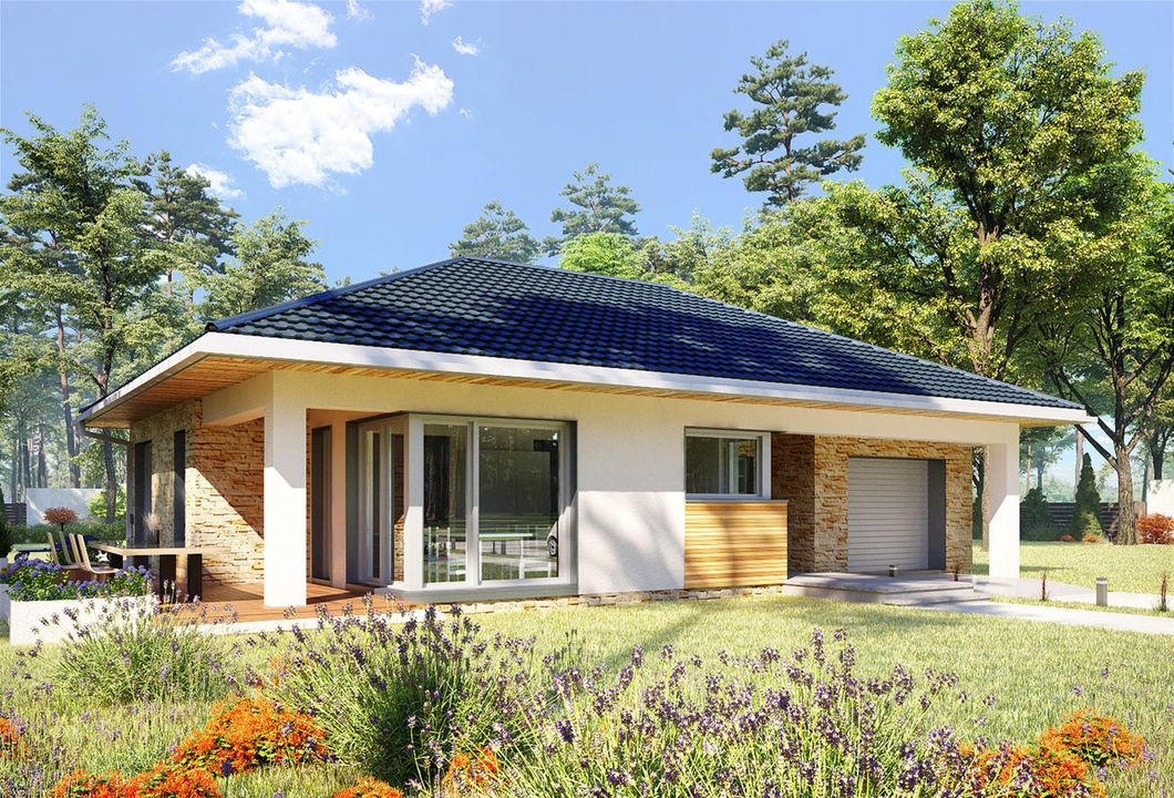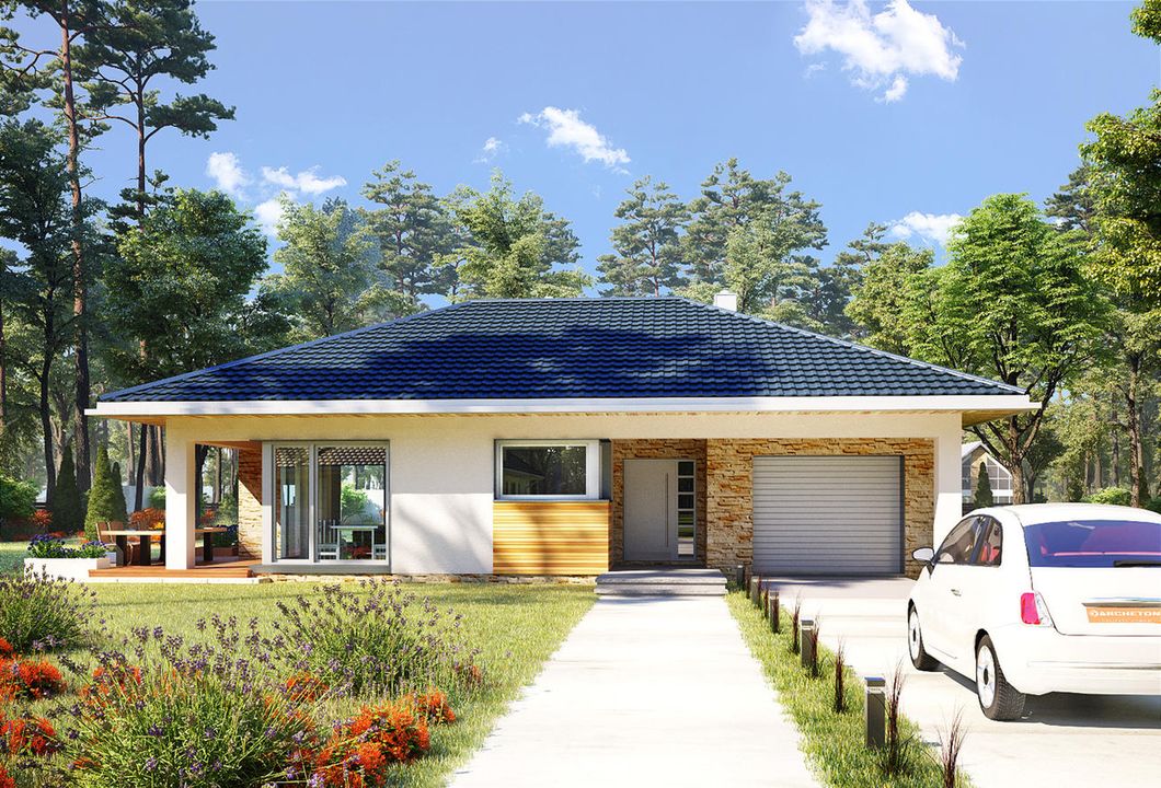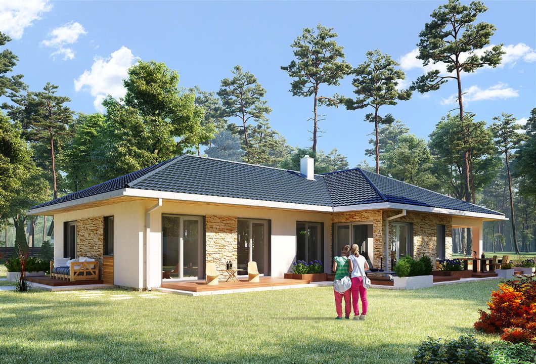 Graficzne opracowanie rzutów poglądowych widocznych na karcie projektu zostało wykonane przez Extradom.pl. Prezentowane przez Extradom.pl wizualizacje wykonane zostały przez autora projektu i należy poczytywać je jedynie za przykład i propozycję wykończenia, wizję architektoniczną autora projektu. Ostateczne wykończenie budynku może nastąpić na wiele sposobów. Szczegółowe rozwiązania zastosowane w oferowanej dokumentacji - w tym również ilość, lokalizacje i wygląd okien, drzwi, kominów - mogą w niewielkim stopniu różnić się od prezentowanej wizualizacji budynku.