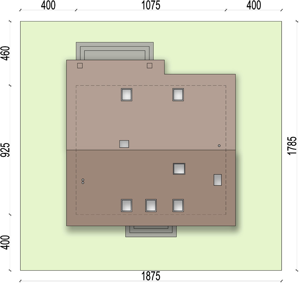 Graficzne opracowanie rzutów poglądowych widocznych na karcie projektu zostało wykonane przez Extradom.pl. Prezentowane przez Extradom.pl wizualizacje wykonane zostały przez autora projektu i należy poczytywać je jedynie za przykład i propozycję wykończenia, wizję architektoniczną autora projektu. Ostateczne wykończenie budynku może nastąpić na wiele sposobów. Szczegółowe rozwiązania zastosowane w oferowanej dokumentacji - w tym również ilość, lokalizacje i wygląd okien, drzwi, kominów - mogą w niewielkim stopniu różnić się od prezentowanej wizualizacji budynku.