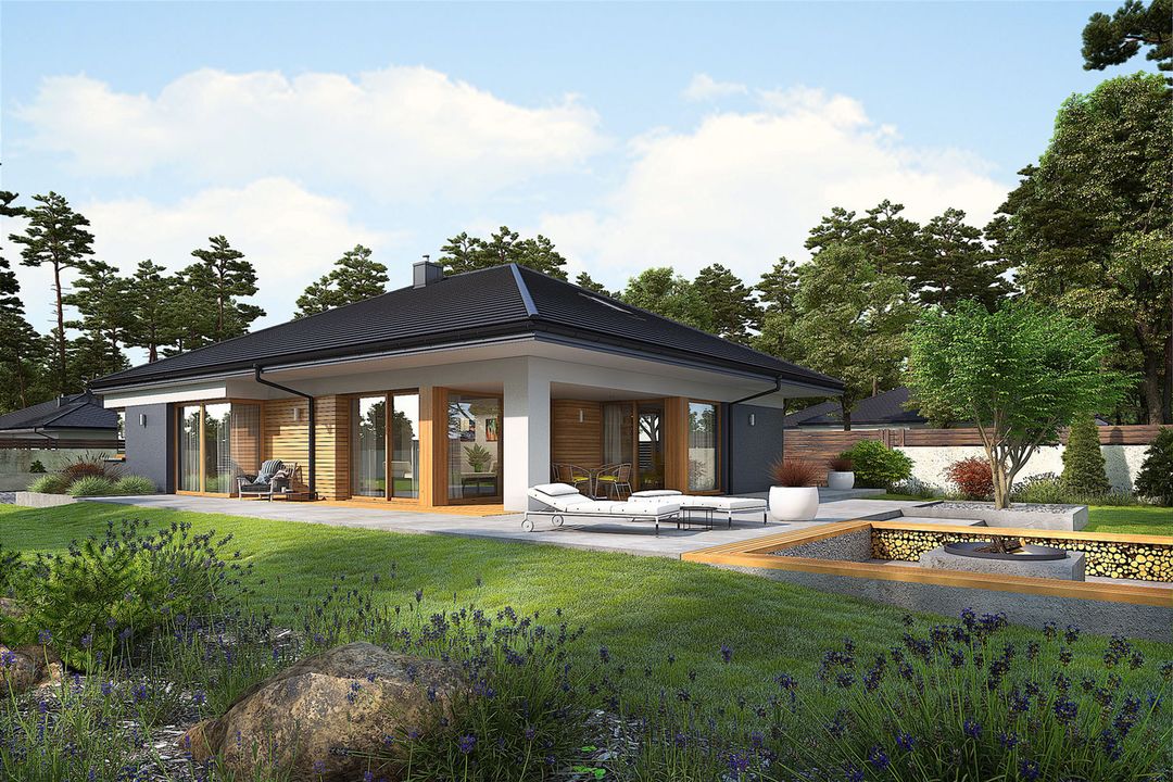 Ściany zewnętrzne: murowane, dwuwarstwowe, beton komórkowy firmy H+H 24 cm, ocieplenie styropian Termo Organika 20 cm. Ściany wewnętrzne: nośne i działowe murowane, beton komórkowy firmy H+H 24 cm i 12 cm. Strop: gęstożebrowy Teriva, ocieplenie wełna mineralna 30 cm. Dach: konstrukcja drewniana, dachówka ceramiczna firmy Röben, więźba dachowa dostępna również w systemie prefabrykacji drewnianej. Ogrzewanie: kocioł gazowy kondensacyjny, rozprowadzenie ciepła: grzejniki. Wentylacja: grawitacyjna. Elewacje: tynk cienkowarstwowy mineralny w kolorze białym TO-PA001 i szarym TO-GY011 z palety firmy Termo Organika, okładzina drewniana. Stolarka: drewniana, PVC lub aluminiowa, drzwi wejściowe i brama garażowa firmy Hörmann. Otoczenie: kostka betonowa i płyty tarasowe firmy Libet, system tarasowy ProDeck - deska kompozytowa Terra w kolorze orzech.
