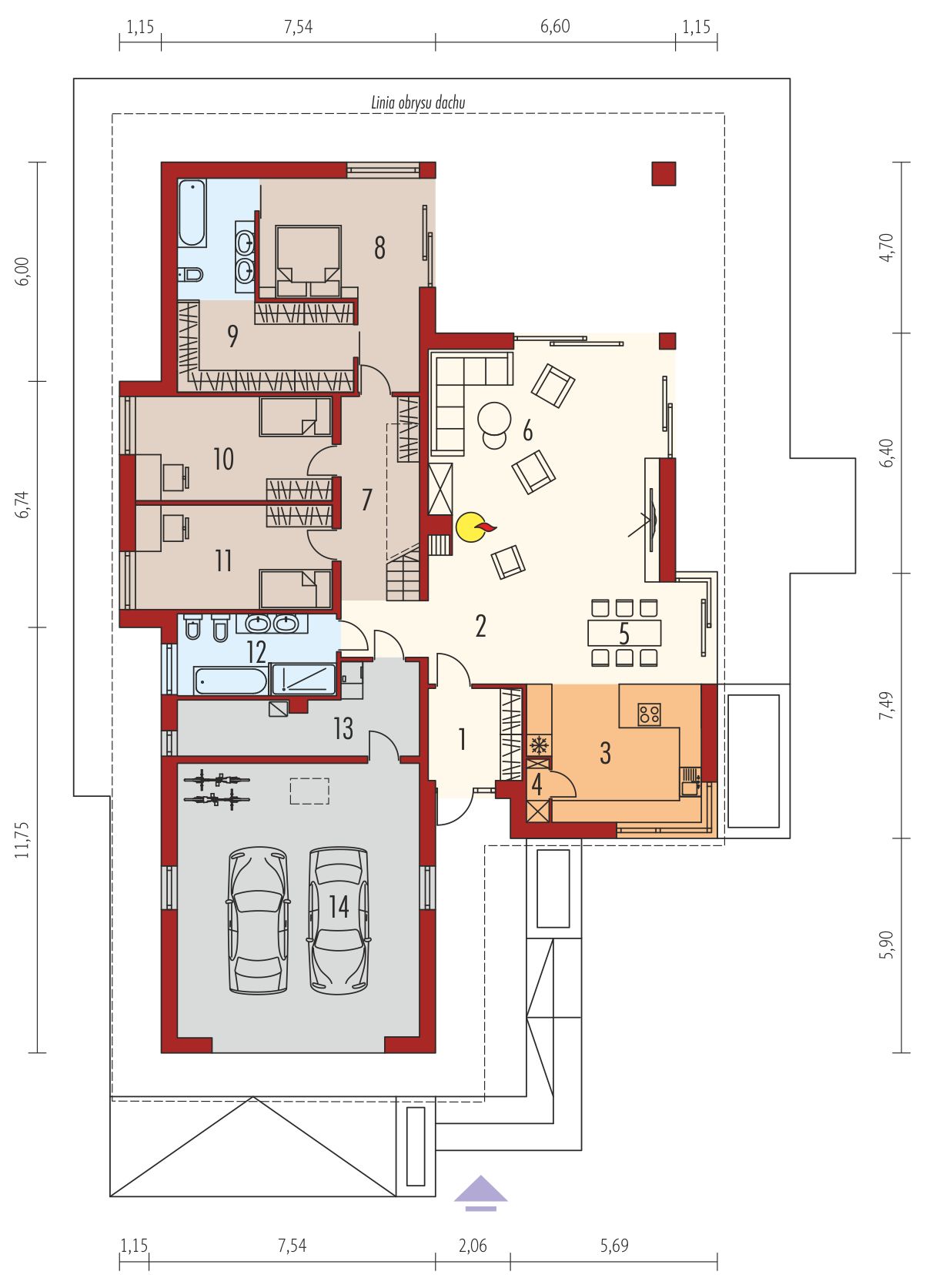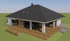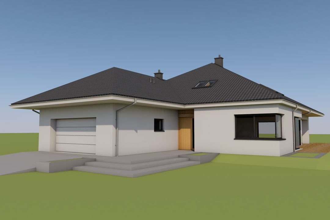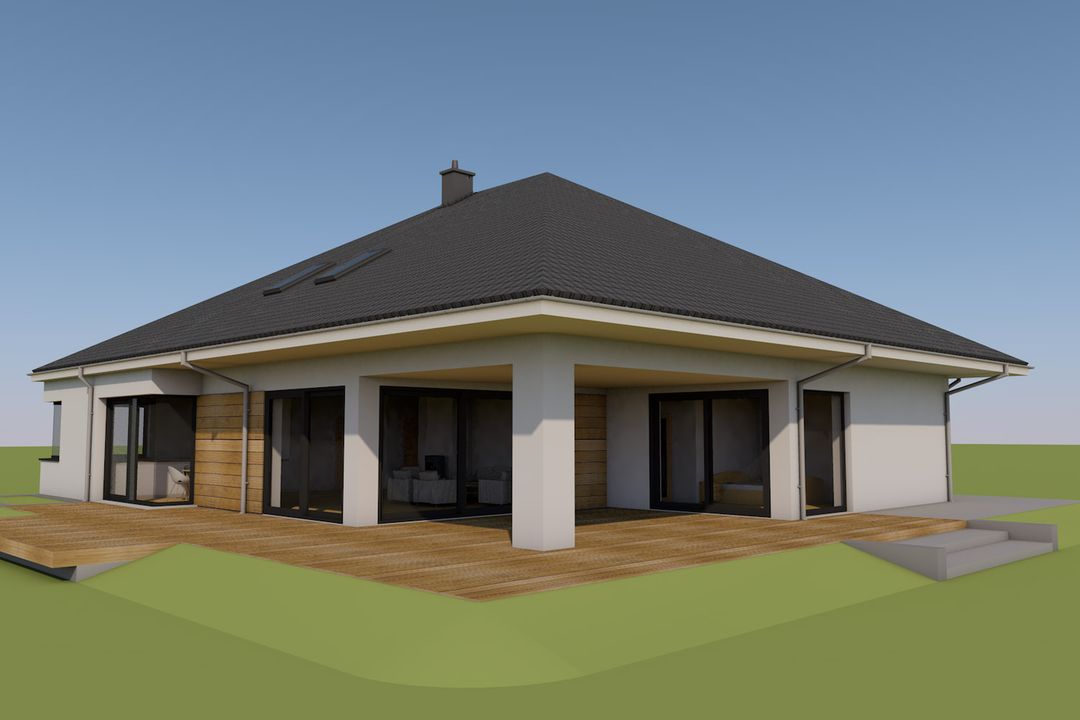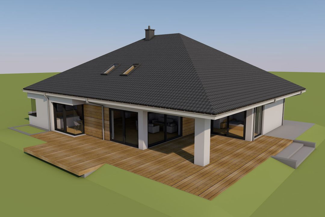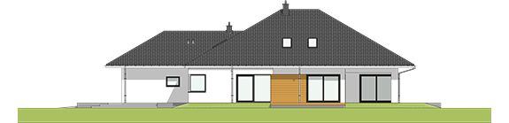 Graficzne opracowanie rzutów poglądowych widocznych na karcie projektu zostało wykonane przez Extradom.pl. Prezentowane przez Extradom.pl wizualizacje wykonane zostały przez autora projektu i należy poczytywać je jedynie za przykład i propozycję wykończenia, wizję architektoniczną autora projektu. Ostateczne wykończenie budynku może nastąpić na wiele sposobów. Szczegółowe rozwiązania zastosowane w oferowanej dokumentacji - w tym również ilość, lokalizacje i wygląd okien, drzwi, kominów - mogą w niewielkim stopniu różnić się od prezentowanej wizualizacji budynku.