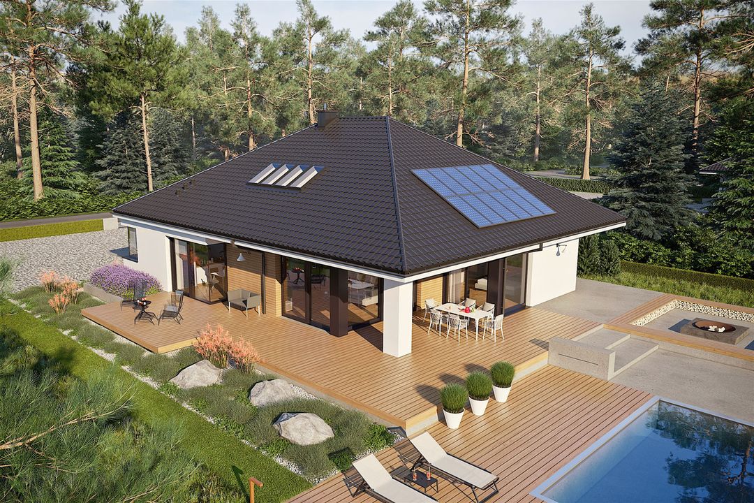 Ściany zewnętrzne: murowane, dwuwarstwowe, beton komórkowy firmy H+H 24 cm, ocieplenie styropian Termo Organika 20 cm. Ściany wewnętrzne: nośne i działowe murowane, beton komórkowy firmy H+H 24 cm i 12 cm. Strop: gęstożebrowy Teriva, ocieplenie wełna mineralna Isover 30 cm. Dach: konstrukcja drewniana, dachówka ceramiczna firmy Röben. Inne: w przypadku adaptacji poddasza na cele mieszkalne schody wewnętrzne drewniane. Ogrzewanie: kocioł gazowy kondensacyjny, rozprowadzenie ciepła: grzejniki. Wentylacja: grawitacyjna. OZE: kolektory słoneczne. Elewacje: tynk cienkowarstwowy mineralny w kolorze białym TO-PA001 z palety firmy Termo Organika, okładzina drewniana. Stolarka: drewniana, PVC lub aluminiowa, drzwi wejściowe i brama garażowa firmy Hörmann. Otoczenie: kostka betonowa i płyty tarasowe firmy Libet, system tarasowy ProDeck - deska kompozytowa Terra w kolorze orzech. Okna połaciowe: w przypadku adaptacji poddasza na cele mieszkalne rozwiązania technologiczne i wyłaz dachowy firmy VELUX.