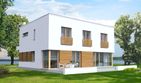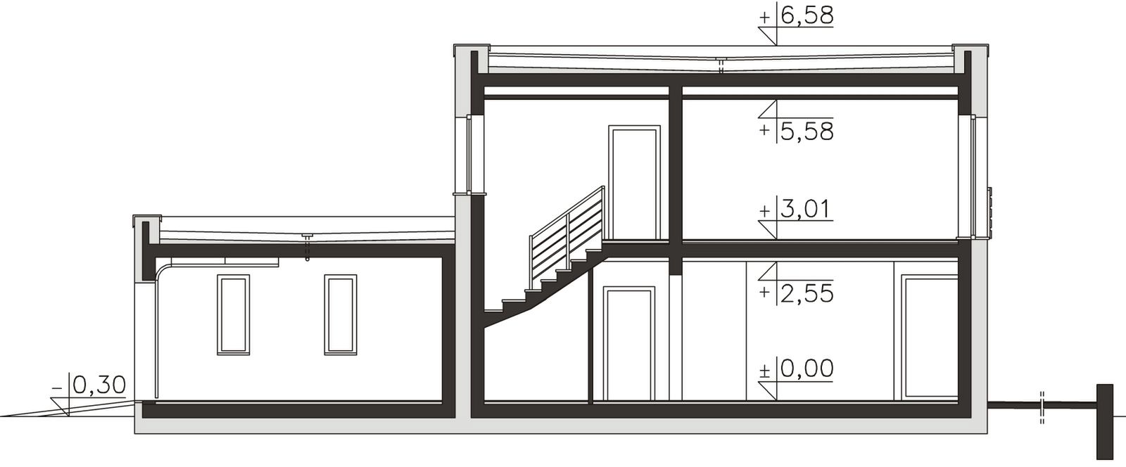Fundamenty - płyta fundamentowa. Ściany zewnętrzne - Bloczek silikatowy 24 cm + styropian 30 cm. Strop - gęstożebrowy. Dach - stropodach żelbetowy. Ogrzewanie - c.o. podłogowe + c.w.u. - pompa ciepła ze źródłem dolnym. Wentylacja - grawitacyjna.