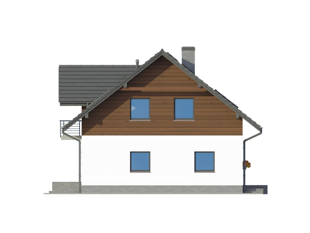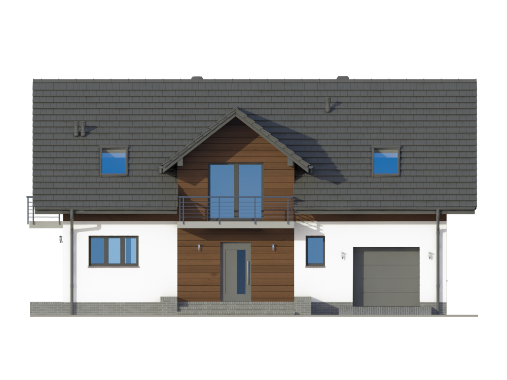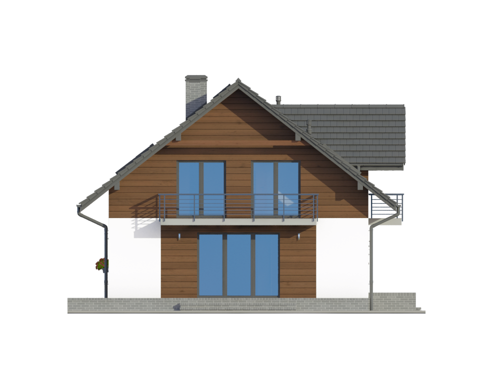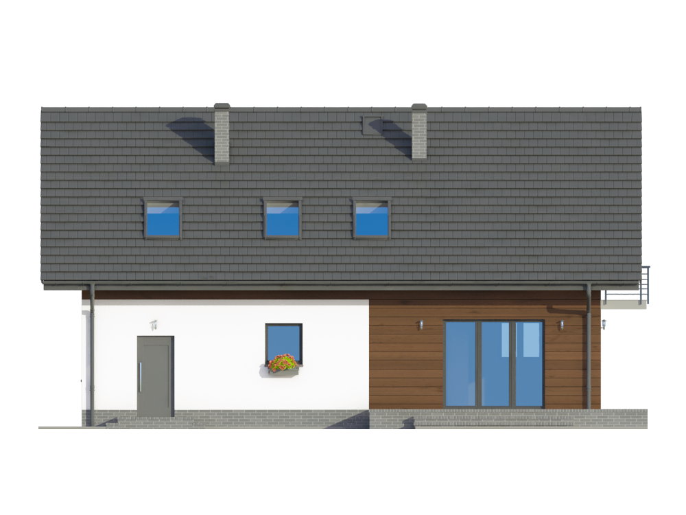 Graficzne opracowanie rzutów poglądowych widocznych na karcie projektu zostało wykonane przez Extradom.pl. Prezentowane przez Extradom.pl wizualizacje wykonane zostały przez autora projektu i należy poczytywać je jedynie za przykład i propozycję wykończenia, wizję architektoniczną autora projektu. Ostateczne wykończenie budynku może nastąpić na wiele sposobów. Szczegółowe rozwiązania zastosowane w oferowanej dokumentacji - w tym również ilość, lokalizacje i wygląd okien, drzwi, kominów - mogą w niewielkim stopniu różnić się od prezentowanej wizualizacji budynku.