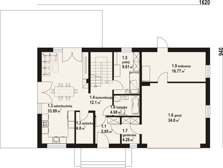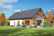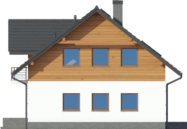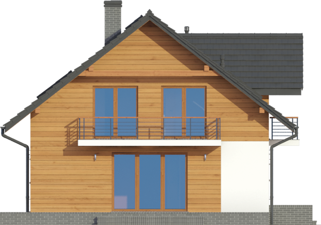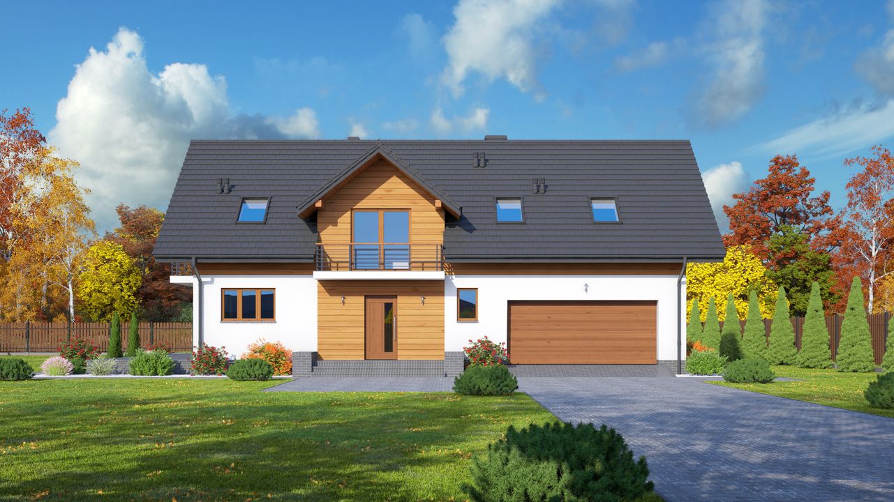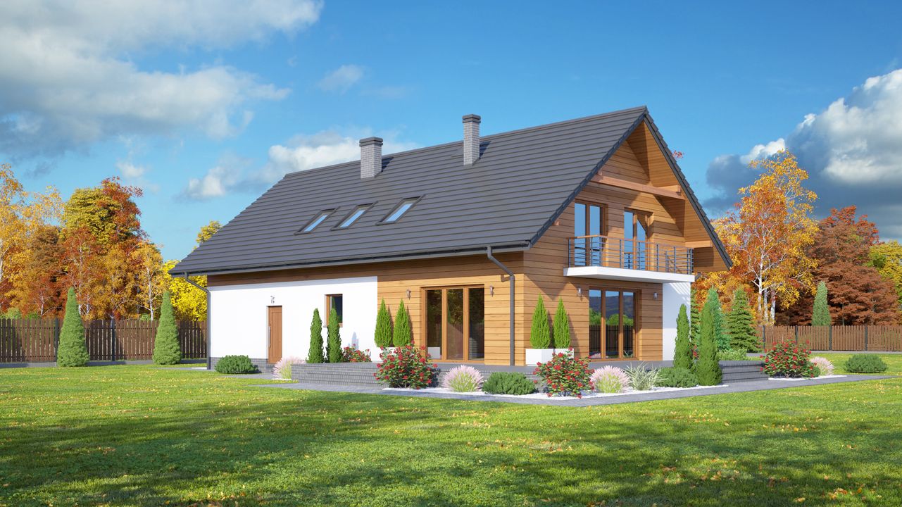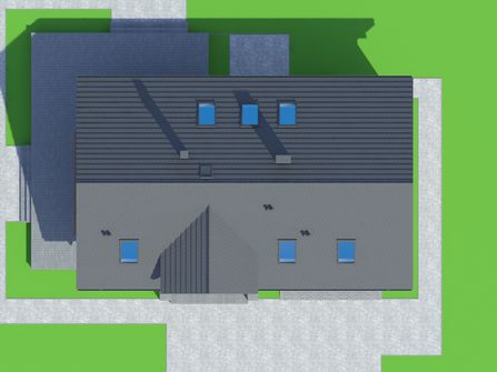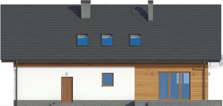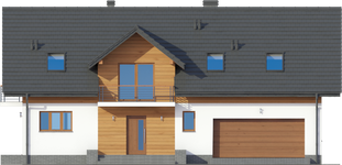 Graficzne opracowanie rzutów poglądowych widocznych na karcie projektu zostało wykonane przez Extradom.pl. Prezentowane przez Extradom.pl wizualizacje wykonane zostały przez autora projektu i należy poczytywać je jedynie za przykład i propozycję wykończenia, wizję architektoniczną autora projektu. Ostateczne wykończenie budynku może nastąpić na wiele sposobów. Szczegółowe rozwiązania zastosowane w oferowanej dokumentacji - w tym również ilość, lokalizacje i wygląd okien, drzwi, kominów - mogą w niewielkim stopniu różnić się od prezentowanej wizualizacji budynku.