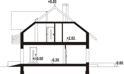 Wysokość ścianki kolankowej: 1.21 m. Strop: płyta żelbetowa. Pokrycie dachu: dachówka ceramiczna. Ściany zewnętrzne: pustaki ceramiczne + styropian. Ściany wewnętrzne: pustaki ceramiczne. Typ ogrzewania: kocioł na paliwo stałe. Inne: okna połaciowe Fakro.