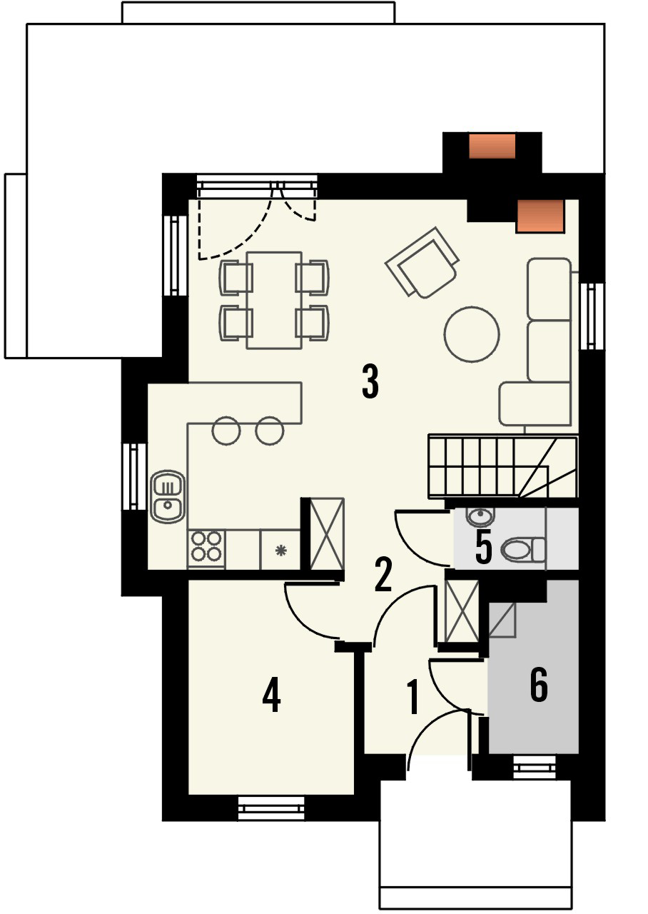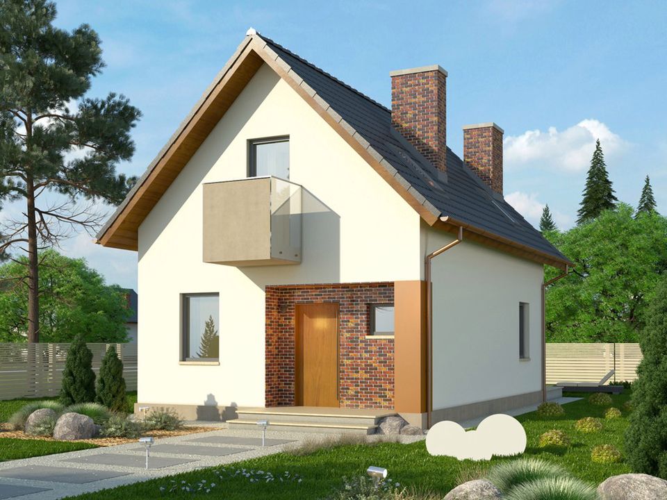 Graficzne opracowanie rzutów poglądowych widocznych na karcie projektu zostało wykonane przez Extradom.pl. Prezentowane przez Extradom.pl wizualizacje wykonane zostały przez autora projektu i należy poczytywać je jedynie za przykład i propozycję wykończenia, wizję architektoniczną autora projektu. Ostateczne wykończenie budynku może nastąpić na wiele sposobów. Szczegółowe rozwiązania zastosowane w oferowanej dokumentacji - w tym również ilość, lokalizacje i wygląd okien, drzwi, kominów - mogą w niewielkim stopniu różnić się od prezentowanej wizualizacji budynku.