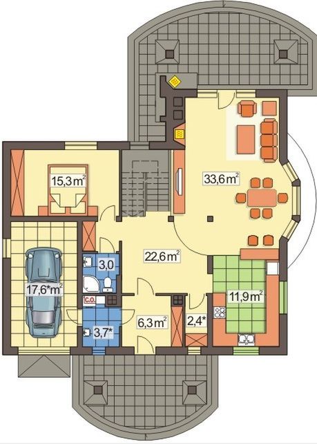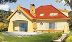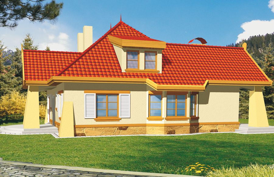 Graficzne opracowanie rzutów poglądowych widocznych na karcie projektu zostało wykonane przez Extradom.pl. Prezentowane przez Extradom.pl wizualizacje wykonane zostały przez autora projektu i należy poczytywać je jedynie za przykład i propozycję wykończenia, wizję architektoniczną autora projektu. Ostateczne wykończenie budynku może nastąpić na wiele sposobów. Szczegółowe rozwiązania zastosowane w oferowanej dokumentacji - w tym również ilość, lokalizacje i wygląd okien, drzwi, kominów - mogą w niewielkim stopniu różnić się od prezentowanej wizualizacji budynku.