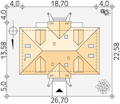 Graficzne opracowanie rzutów poglądowych widocznych na karcie projektu zostało wykonane przez Extradom.pl. Prezentowane przez Extradom.pl wizualizacje wykonane zostały przez autora projektu i należy poczytywać je jedynie za przykład i propozycję wykończenia, wizję architektoniczną autora projektu. Ostateczne wykończenie budynku może nastąpić na wiele sposobów. Szczegółowe rozwiązania zastosowane w oferowanej dokumentacji - w tym również ilość, lokalizacje i wygląd okien, drzwi, kominów - mogą w niewielkim stopniu różnić się od prezentowanej wizualizacji budynku.