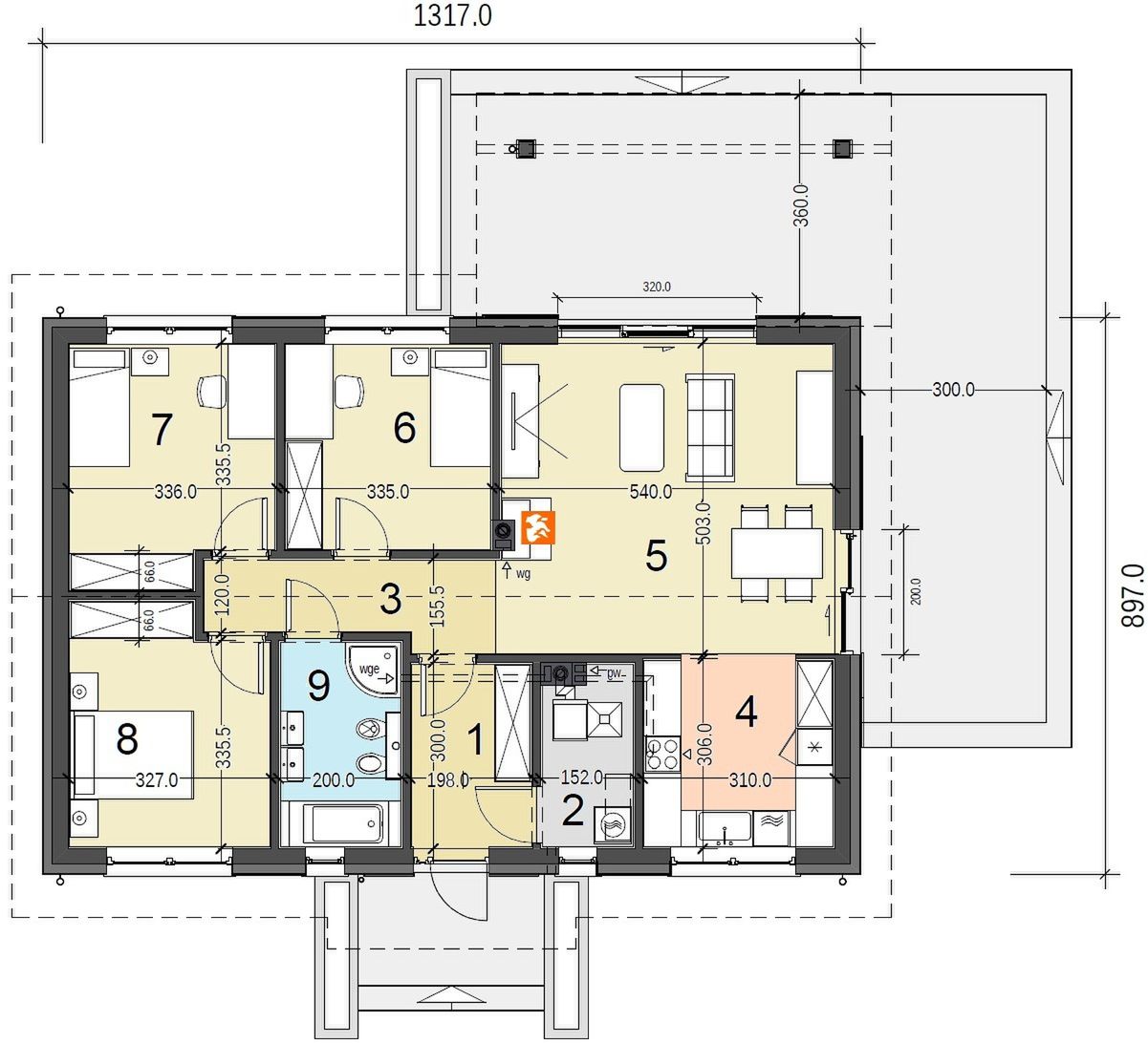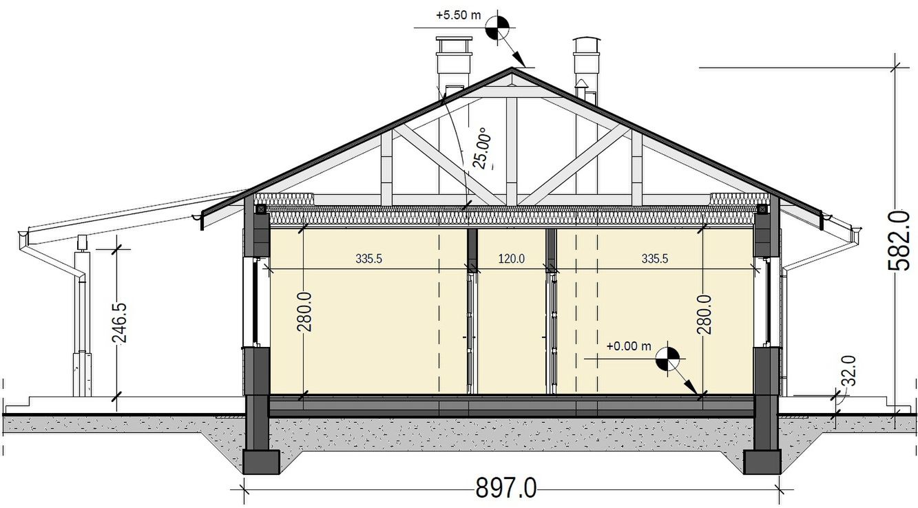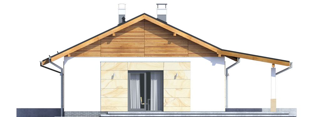 Posadowienie bezpośrednie na zbrojonych ławach i stopach fundamentowych wykonanych z betonu B 20. Ściany fundamentowe: murowane z bloczków betonowych M6. Ściany zewnętrzne, nośne: bloczki gazobetonowe gr. 25 cm na zaprawie systemowej, ciepłochronnej, ocieplony styropianem fasadowym gr. 15 cm. Do ocieplenia budynku zaprojektowano użycie styropianu grafitowego gr. 15 cm, o współczynniku „lambda” nie przekraczającym 0,035 W(mK) i „oporze cieplnym” nie mniejszym niż Rd – 4,0 m2k/W. Zastosowanie materiałów budowlanych (ocieplenie ścian, dachu, podłogi na gruncie, okien i drzwi zewnętrznych) użytych w projekcie odpowiada nowym wymaganiom obowiązującym od stycznia 2021 roku (WT2021). Ściany wewnętrzne działowe: bloczki gazobetonowe gr. 12 cm. Strop z płyt GK na ruszcie stalowym, podwieszonym do dolnych pasów drewnianych wiązarów dachowych. Konstrukcja dachu: drewniana, drewno klasy C24, więźba dachu głównego w formie wiązarów opartych na ścianach zewnętrznych, dach dwuspadowy z jednospadowym zadaszeniem tarasu. Pokrycie dachu zaprojektowano z blachy ocynkowanej, powlekanej, mocowanej na rąbek stojący, alternatywnie pokrycie można wykonać z dachówki ceramicznej czy betonowej. Budynek, w wersji podstawowej, jest zaprojektowany z pomieszczeniem kotłowni wyposażonej w kocioł ekologiczny na paliwo stałe, biomasę (granulat drzewny – pellet) i spełnia wszystkie wymagania dotyczące WT2021. Istnieje możliwość zamówienia dokumentacji projektowej w wersji ogrzewania gazowego ze wspomaganiem instalacją solarną lub ogrzewania nowoczesną pompa ciepła typu powietrze – woda i ogrzewaniem podłogowym (zapytaj o cenę). Standard energetyczny budynku, w każdej wersji ogrzewania jest w pełni spełniający wymagania WT2021. Projekt pod względem konstrukcyjnym spełnia normy zgodne z Eurokodami.