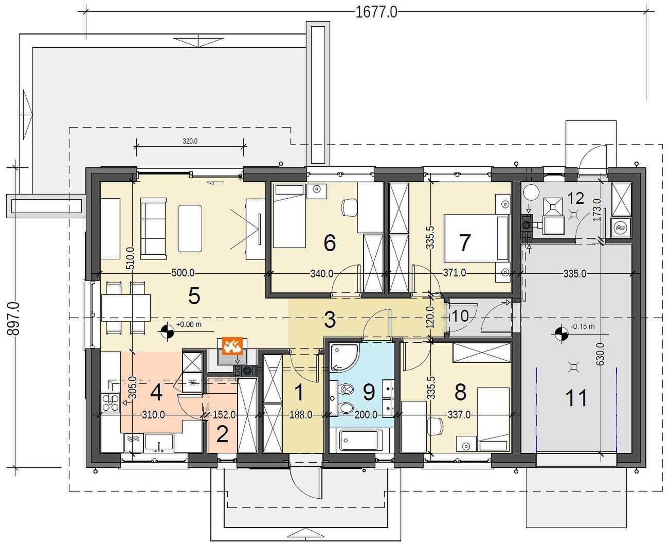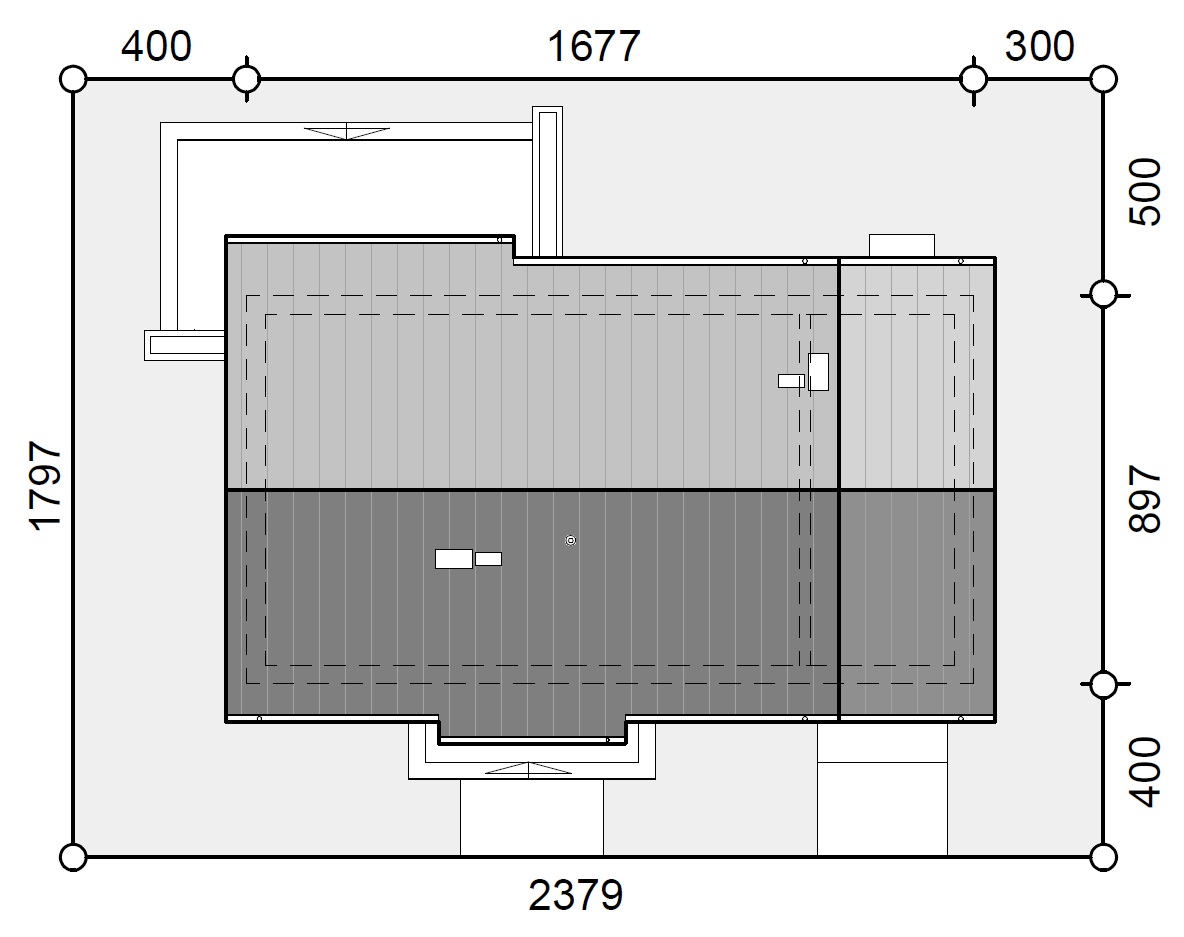 Posadowienie bezpośrednie na zbrojonych ławach i stopach fundamentowych wykonanych z betonu B 20. Ściany fundamentowe: murowane z bloczków betonowych M6. Ściany zewnętrzne, nośne: bloczki gazobetonowe gr. 25 cm na zaprawie systemowej, ciepłochronnej, ocieplony styropianem fasadowym gr. 15 cm. Do ocieplenia budynku zaprojektowano użycie styropianu grafitowego gr. 15 cm, o współczynniku „lambda” nie przekraczającym 0,035 W(mK) i „oporze cieplnym” nie mniejszym niż Rd – 4,0 m2k/W. Zastosowanie materiałów budowlanych (ocieplenie ścian, dachu, podłogi na gruncie, okien i drzwi zewnętrznych) użytych w projekcie odpowiada nowym wymaganiom obowiązującym od stycznia 2021 roku (WT2021). Ściany wewnętrzne działowe: bloczki gazobetonowe gr. 12 cm. Strop z płyt GK na ruszcie stalowym, podwieszonym do dolnych pasów drewnianych wiązarów dachowych. Konstrukcja dachu: drewniana, drewno klasy C24, więźba dachu głównego w formie wiązarów opartych na ścianach zewnętrznych, dach dwuspadowy. Pokrycie dachu zaprojektowano z dachówki ceramicznej lub betonowej, alternatywnie można wykonać z blachy ocynkowanej, powlekanej, mocowanej na rąbek stojący. Budynek, w wersji podstawowej, jest zaprojektowany z pomieszczeniem kotłowni wyposażonej w kocioł ekologiczny na paliwo stałe, biomasę (granulat drzewny – pellet) i spełnia wszystkie wymagania dotyczące WT2021. Istnieje możliwość zamówienia dokumentacji projektowej w wersji ogrzewania gazowego ze wspomaganiem instalacją solarną lub ogrzewania nowoczesną pompa ciepła typu powietrze – woda i ogrzewaniem podłogowym (zapytaj o cenę). Standard energetyczny budynku, w każdej wersji ogrzewania jest w pełni spełniający wymagania WT2021. Projekt pod względem konstrukcyjnym spełnia normy zgodne z Eurokodami.