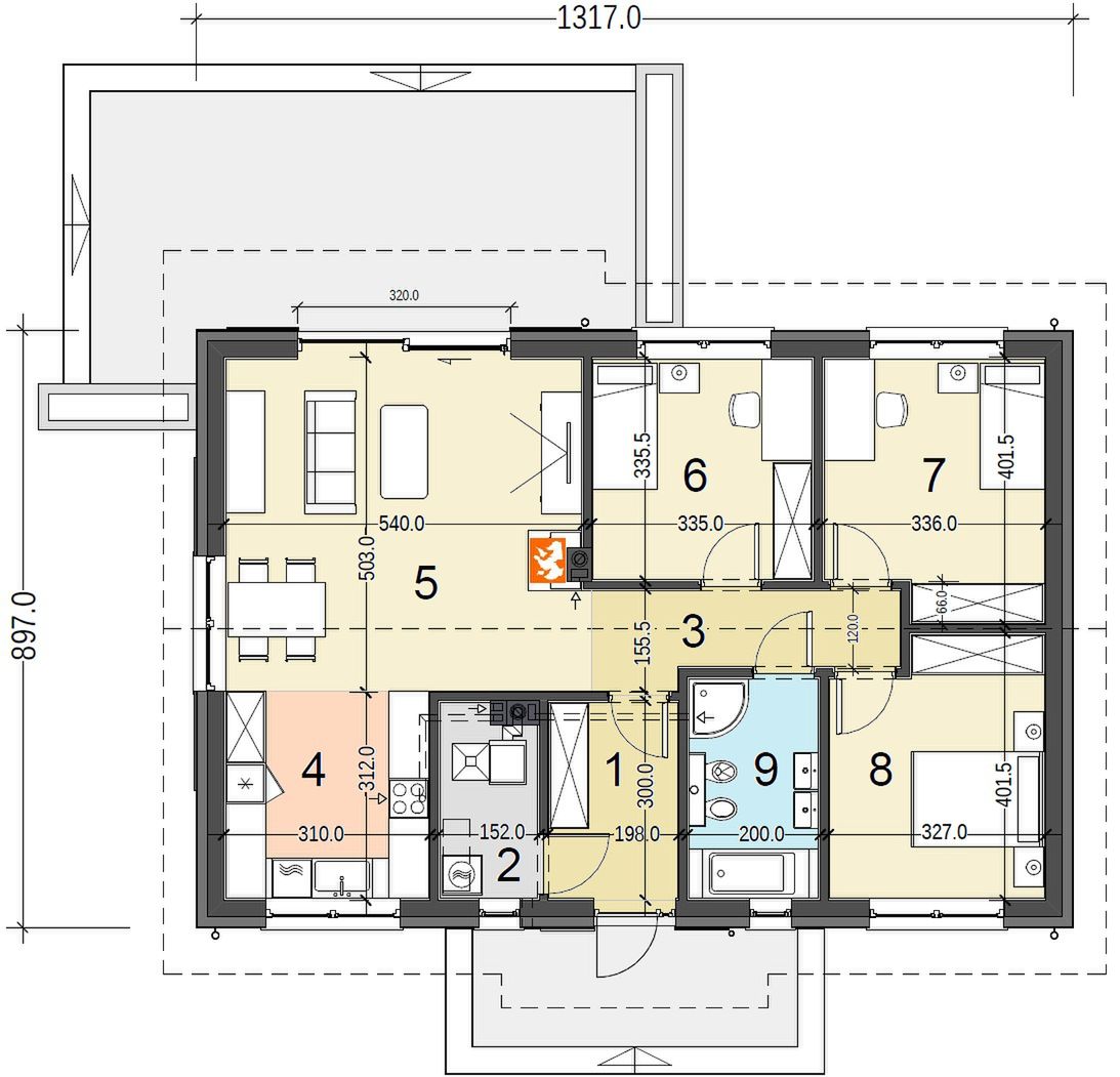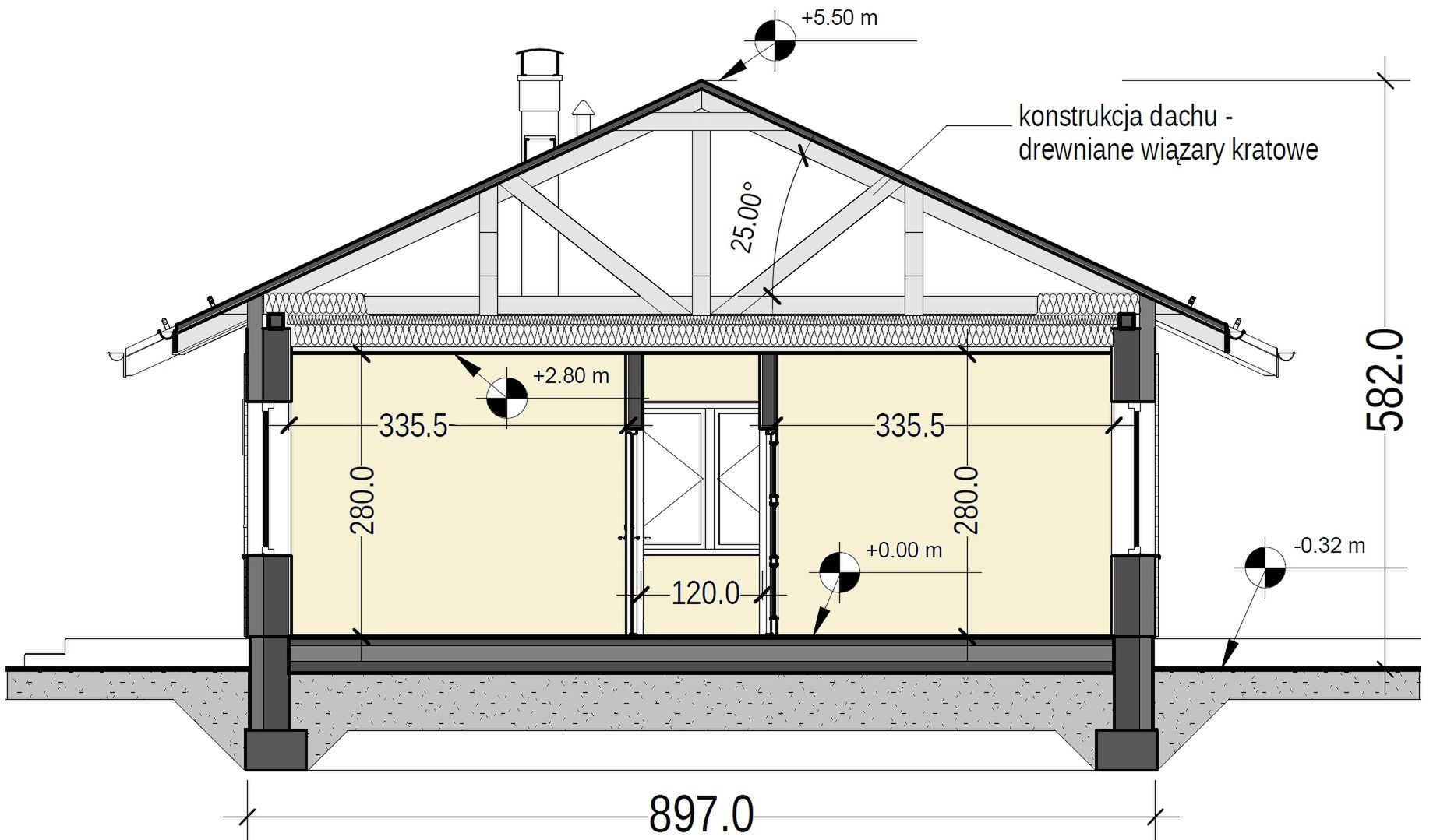 Posadowienie bezpośrednie na zbrojonych ławach i stopach fundamentowych wykonanych z betonu B 20. Ściany fundamentowe: murowane z bloczków betonowych M6. Ściany zewnętrzne, nośne: bloczki gazobetonowe gr. 25 cm na zaprawie systemowej, ciepłochronnej, ocieplony styropianem fasadowym gr. 15 cm. Do ocieplenia budynku zaprojektowano użycie styropianu grafitowego gr. 15 cm, o współczynniku „lambda” nie przekraczającym 0,035 W(mK) i „oporze cieplnym” nie mniejszym niż Rd – 4,0 m2k/W. Zastosowanie materiałów budowlanych (ocieplenie ścian, dachu, podłogi na gruncie, okien i drzwi zewnętrznych) użytych w projekcie odpowiada nowym wymaganiom obowiązującym od stycznia 2021 roku (WT2021). Ściany wewnętrzne działowe: bloczki gazobetonowe gr. 12 cm. Strop z płyt GK na ruszcie stalowym, podwieszonym do dolnych pasów drewnianych wiązarów dachowych. Konstrukcja dachu: drewniana, drewno klasy C24, więźba dachu głównego w formie wiązarów opartych na ścianach zewnętrznych, dach dwuspadowy. Pokrycie dachu zaprojektowano z dachówki ceramicznej lub betonowej, alternatywnie można wykonać z blachy ocynkowanej, powlekanej, mocowanej na rąbek stojący. Budynek, w wersji podstawowej, jest zaprojektowany z pomieszczeniem kotłowni wyposażonej w kocioł ekologiczny na paliwo stałe, biomasę (granulat drzewny – pellet) i spełnia wszystkie wymagania dotyczące WT2021. Istnieje możliwość zamówienia dokumentacji projektowej w wersji ogrzewania gazowego ze wspomaganiem instalacją solarną lub ogrzewania nowoczesną pompa ciepła typu powietrze – woda i ogrzewaniem podłogowym (zapytaj o cenę). Standard energetyczny budynku, w każdej wersji ogrzewania jest w pełni spełniający wymagania WT2021. Projekt pod względem konstrukcyjnym spełnia normy zgodne z Eurokodami.