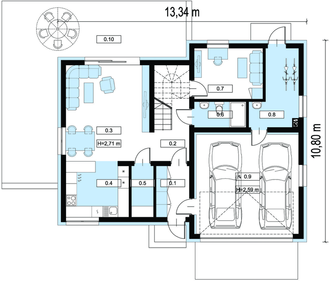 W budynku, zaprojektowanym w technologii murowanej ze stropem teriva przewidziano system rekuperacji oraz ogrzewania podłogowego. Dokumentacja zawiera podstawowe zestawienia materiałów, w tym zestawienie stolarki, elementów więźby dachowej i stali zbrojeniowej.
