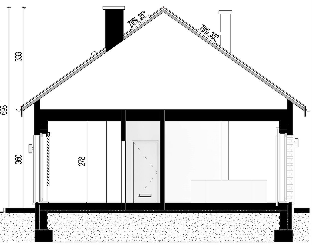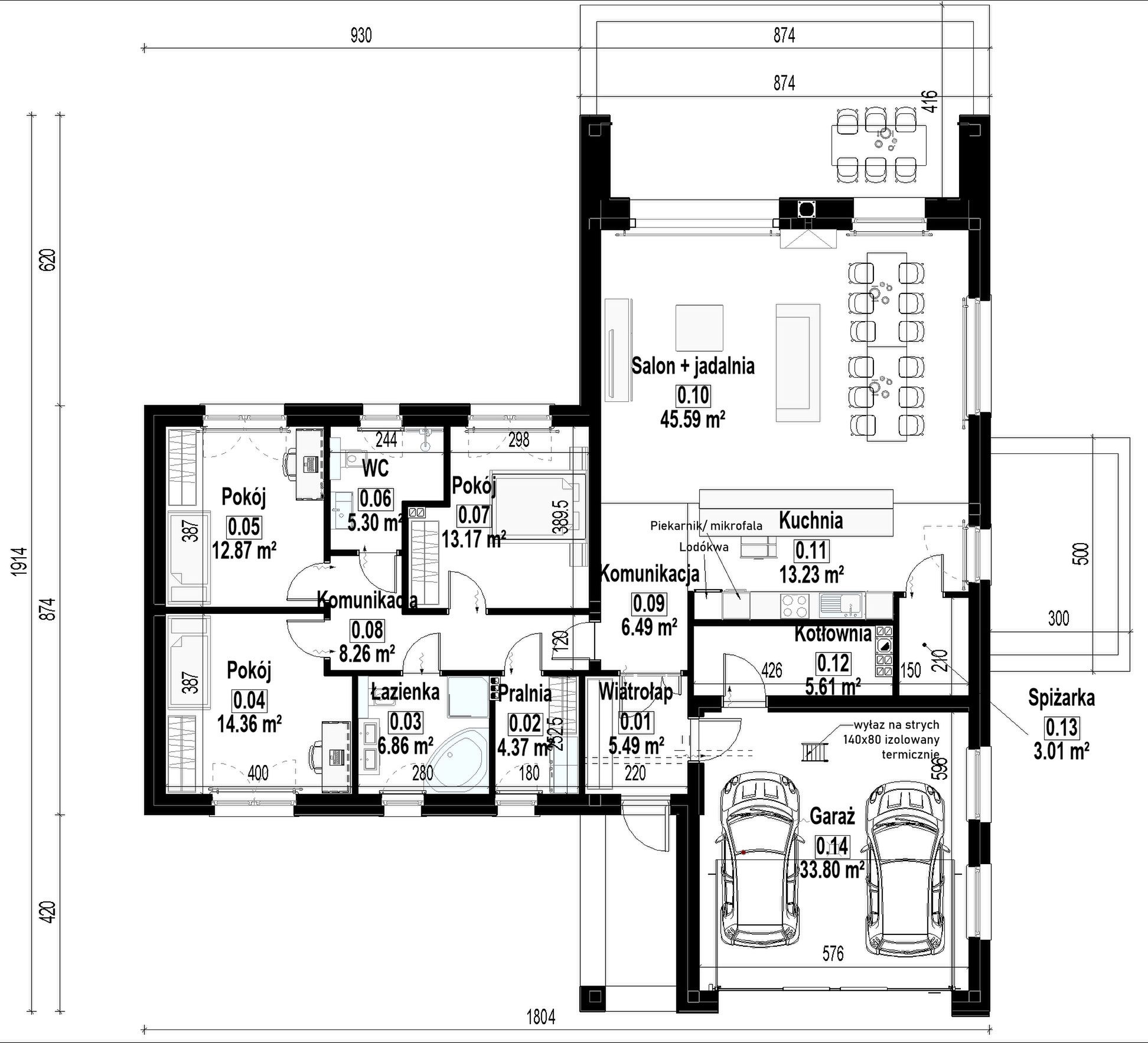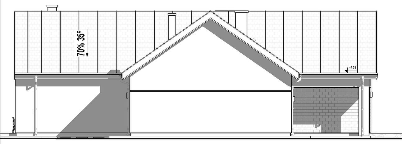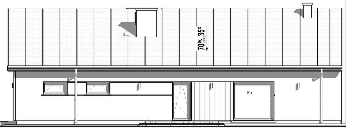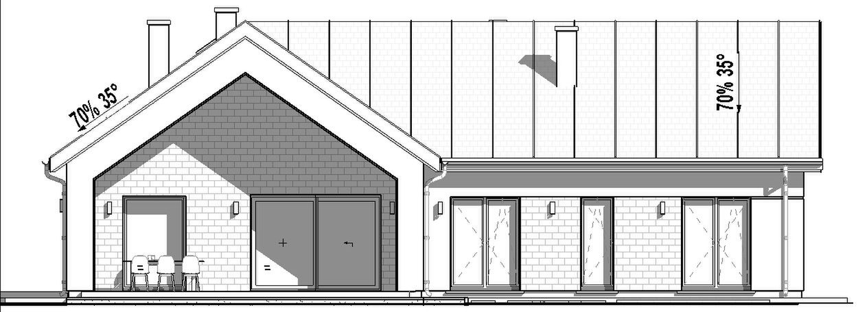 FUNDAMENTY : tradycyjne - ławy i stopy fundamentowe; ŚCIANY ZEWNĘTRZNE: gazobeton + styropian 20 cm; ELEWACJA: tynk, deska elewacyjna, cegła; STROP: drewniany; KONSTRUKCJA DACHU: prefabrykowana kratownica drewniana, pokrycie dachówką ceramiczną lub cementową; OGRZEWANIE: Powietrzna pompa ciepła o mocy 6-7 kW typu powietrze- woda z ogrzewaniem podłogowym; WENTYLACJA: grawitacyjna;