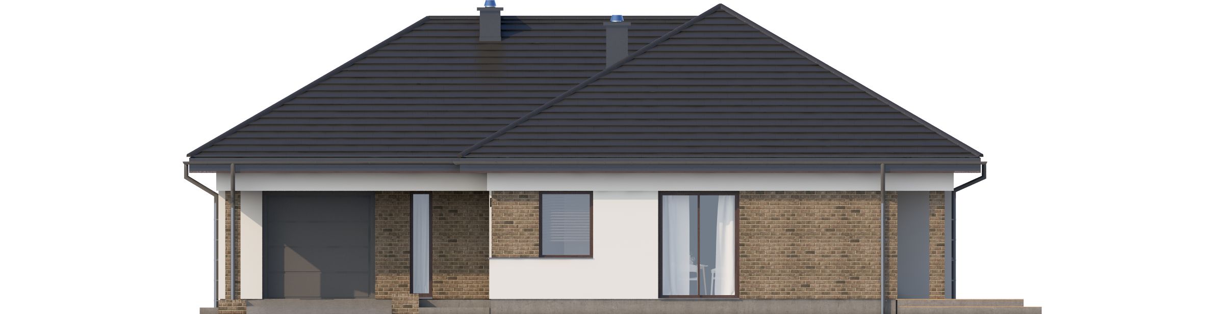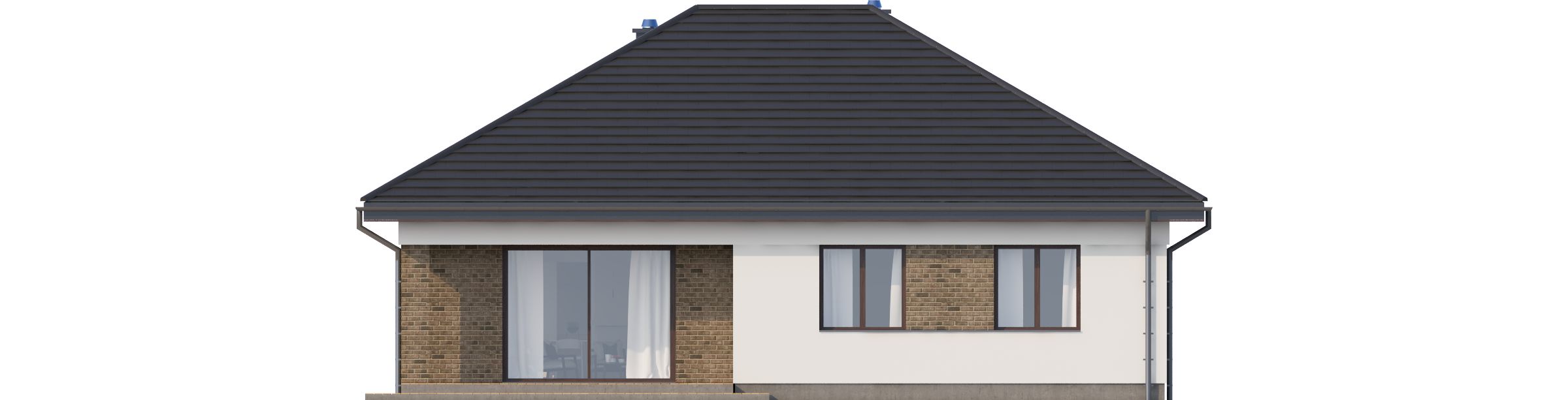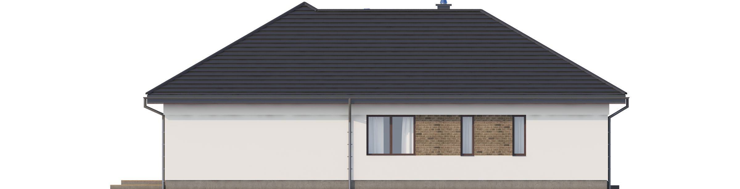 Graficzne opracowanie rzutów poglądowych widocznych na karcie projektu zostało wykonane przez Extradom.pl. Prezentowane przez Extradom.pl wizualizacje wykonane zostały przez autora projektu i należy poczytywać je jedynie za przykład i propozycję wykończenia, wizję architektoniczną autora projektu. Ostateczne wykończenie budynku może nastąpić na wiele sposobów. Szczegółowe rozwiązania zastosowane w oferowanej dokumentacji - w tym również ilość, lokalizacje i wygląd okien, drzwi, kominów - mogą w niewielkim stopniu różnić się od prezentowanej wizualizacji budynku.