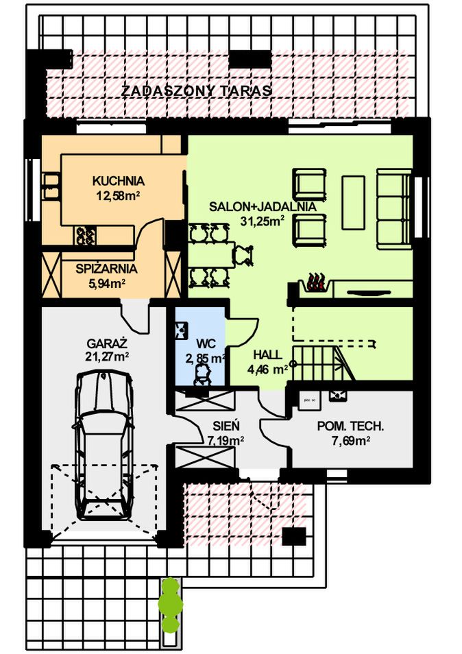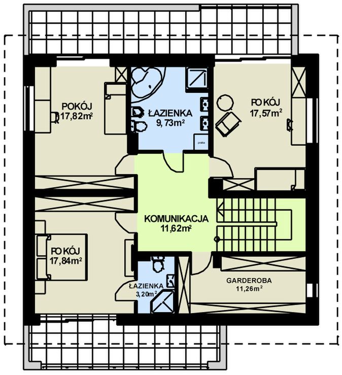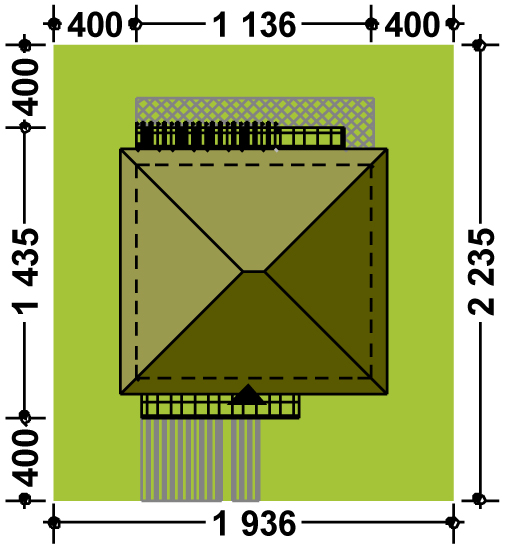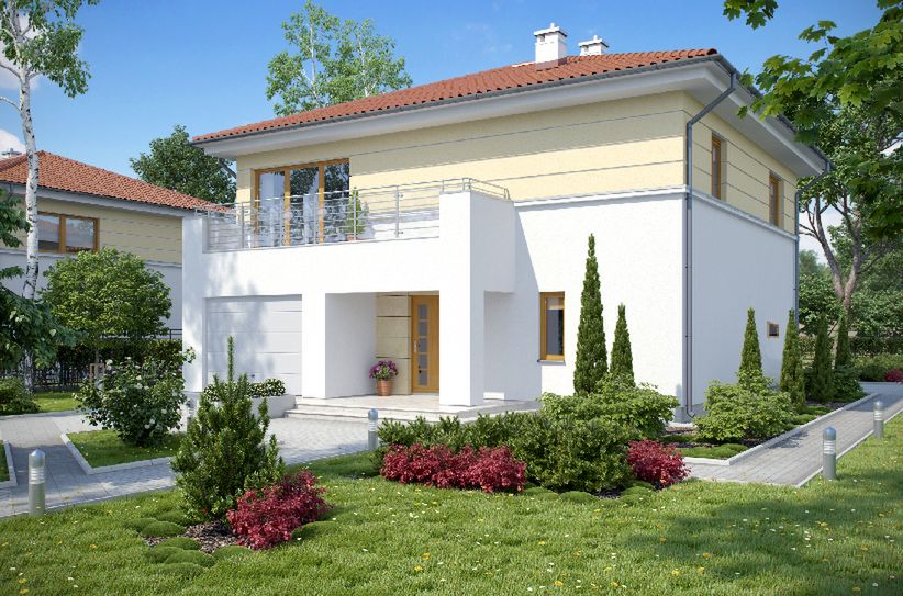 Graficzne opracowanie rzutów poglądowych widocznych na karcie projektu zostało wykonane przez Extradom.pl. Prezentowane przez Extradom.pl wizualizacje wykonane zostały przez autora projektu i należy poczytywać je jedynie za przykład i propozycję wykończenia, wizję architektoniczną autora projektu. Ostateczne wykończenie budynku może nastąpić na wiele sposobów. Szczegółowe rozwiązania zastosowane w oferowanej dokumentacji - w tym również ilość, lokalizacje i wygląd okien, drzwi, kominów - mogą w niewielkim stopniu różnić się od prezentowanej wizualizacji budynku.