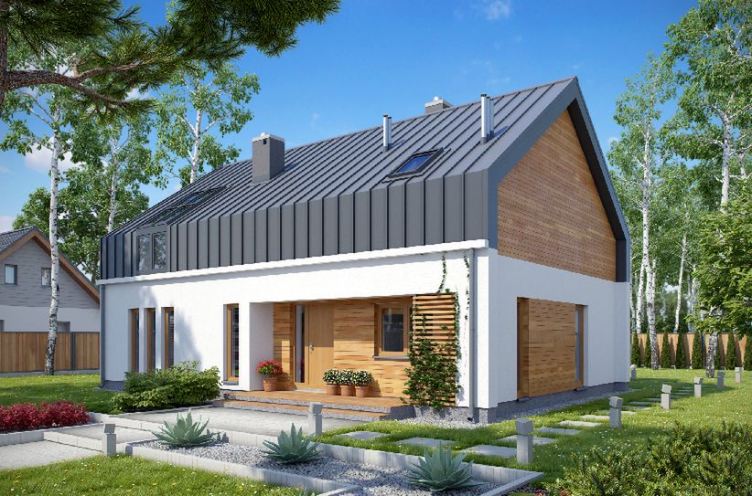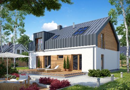 Graficzne opracowanie rzutów poglądowych widocznych na karcie projektu zostało wykonane przez Extradom.pl. Prezentowane przez Extradom.pl wizualizacje wykonane zostały przez autora projektu i należy poczytywać je jedynie za przykład i propozycję wykończenia, wizję architektoniczną autora projektu. Ostateczne wykończenie budynku może nastąpić na wiele sposobów. Szczegółowe rozwiązania zastosowane w oferowanej dokumentacji - w tym również ilość, lokalizacje i wygląd okien, drzwi, kominów - mogą w niewielkim stopniu różnić się od prezentowanej wizualizacji budynku.
