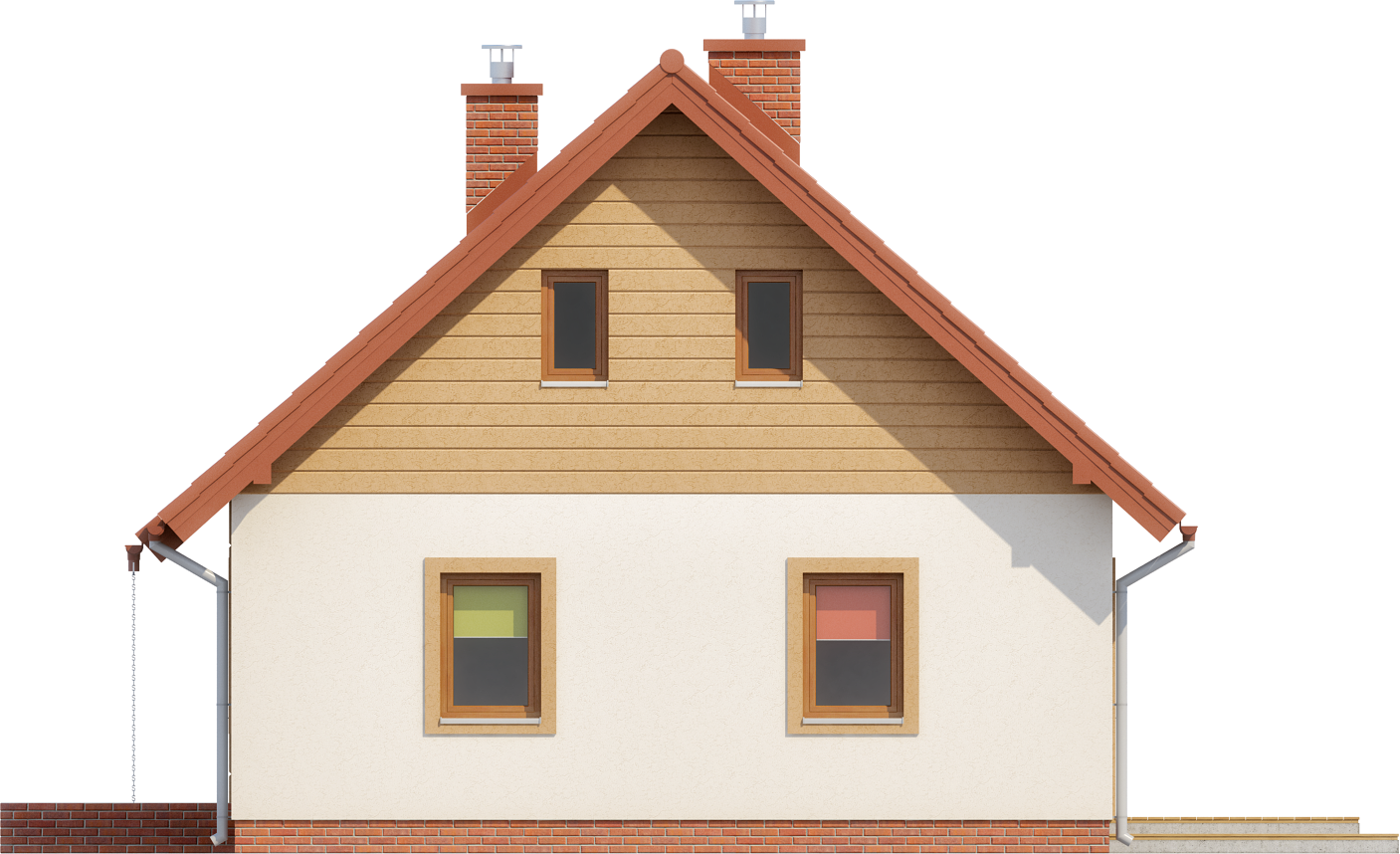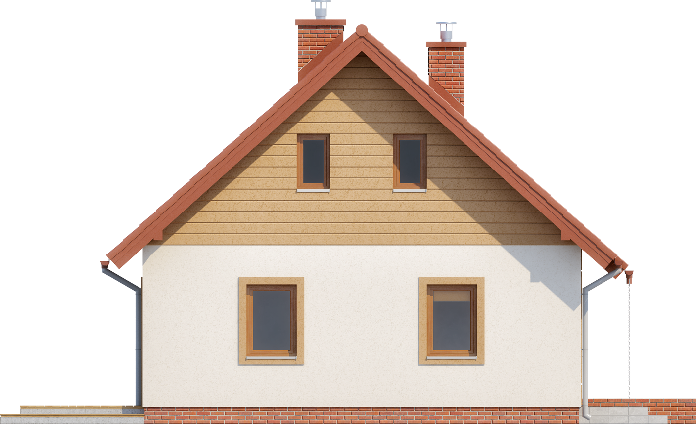 Graficzne opracowanie rzutów poglądowych widocznych na karcie projektu zostało wykonane przez Extradom.pl. Prezentowane przez Extradom.pl wizualizacje wykonane zostały przez autora projektu i należy poczytywać je jedynie za przykład i propozycję wykończenia, wizję architektoniczną autora projektu. Ostateczne wykończenie budynku może nastąpić na wiele sposobów. Szczegółowe rozwiązania zastosowane w oferowanej dokumentacji - w tym również ilość, lokalizacje i wygląd okien, drzwi, kominów - mogą w niewielkim stopniu różnić się od prezentowanej wizualizacji budynku.