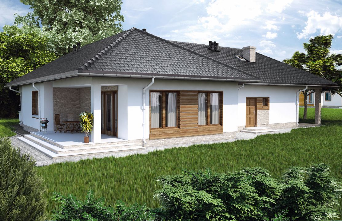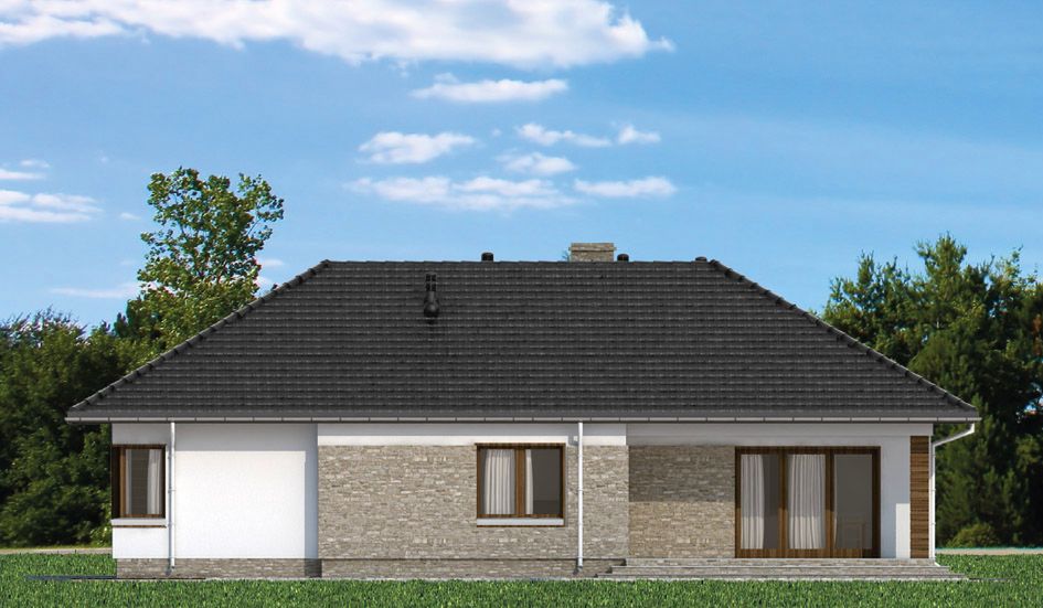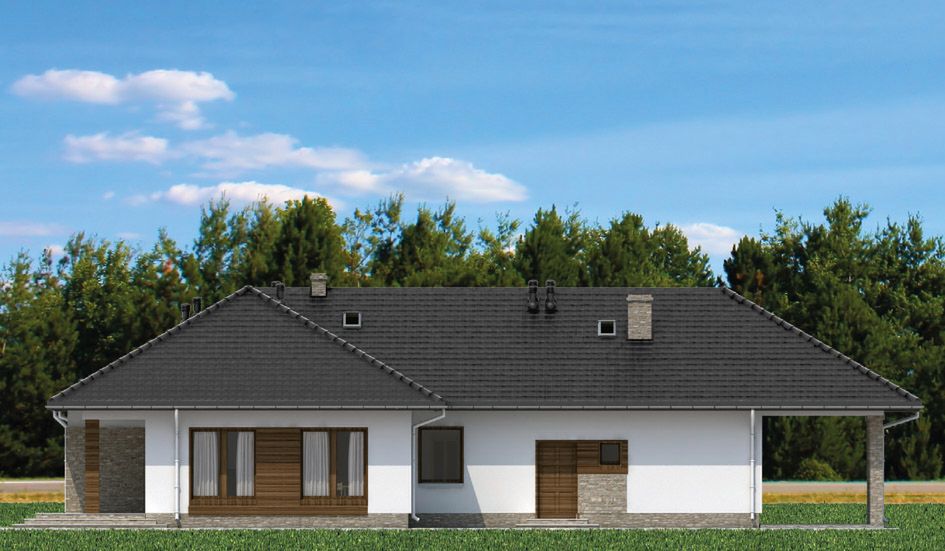Graficzne opracowanie rzutów poglądowych widocznych na karcie projektu zostało wykonane przez Extradom.pl. Prezentowane przez Extradom.pl wizualizacje wykonane zostały przez autora projektu i należy poczytywać je jedynie za przykład i propozycję wykończenia, wizję architektoniczną autora projektu. Ostateczne wykończenie budynku może nastąpić na wiele sposobów. Szczegółowe rozwiązania zastosowane w oferowanej dokumentacji - w tym również ilość, lokalizacje i wygląd okien, drzwi, kominów - mogą w niewielkim stopniu różnić się od prezentowanej wizualizacji budynku.