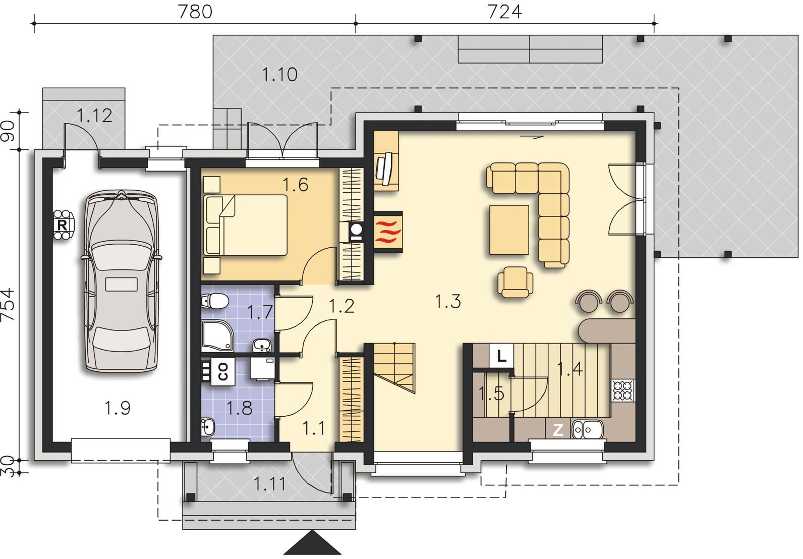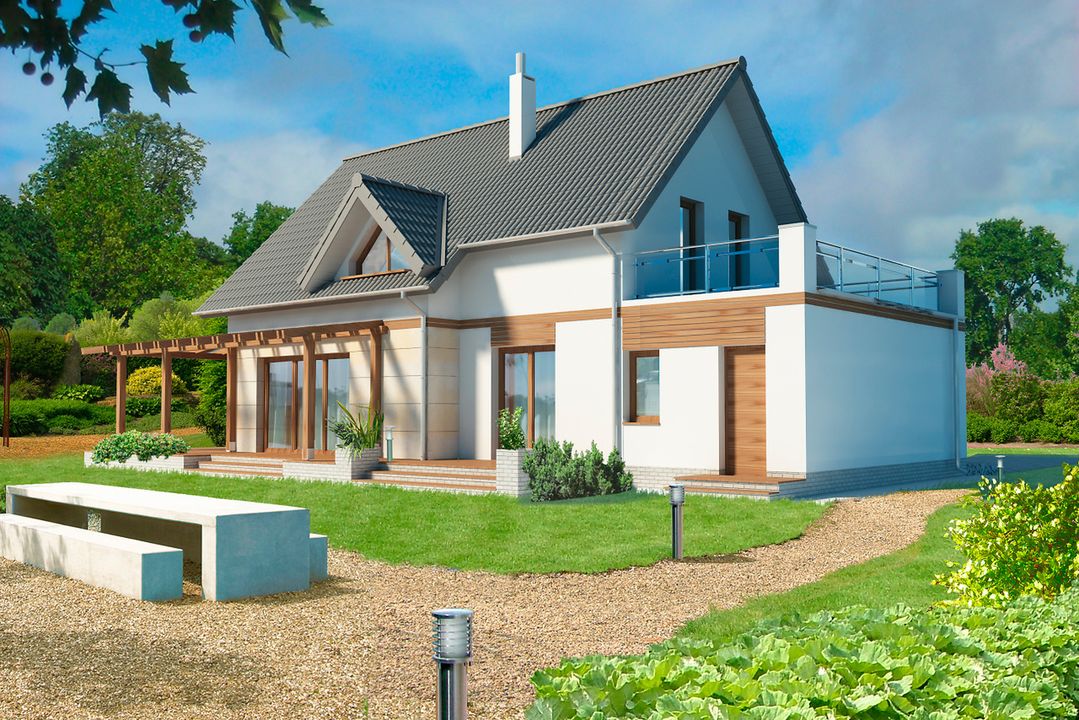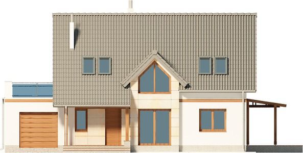 Graficzne opracowanie rzutów poglądowych widocznych na karcie projektu zostało wykonane przez Extradom.pl. Prezentowane przez Extradom.pl wizualizacje wykonane zostały przez autora projektu i należy poczytywać je jedynie za przykład i propozycję wykończenia, wizję architektoniczną autora projektu. Ostateczne wykończenie budynku może nastąpić na wiele sposobów. Szczegółowe rozwiązania zastosowane w oferowanej dokumentacji - w tym również ilość, lokalizacje i wygląd okien, drzwi, kominów - mogą w niewielkim stopniu różnić się od prezentowanej wizualizacji budynku.