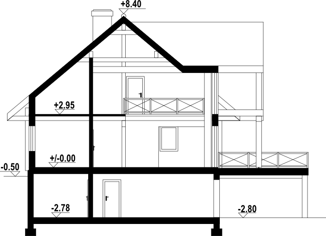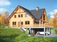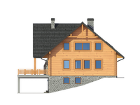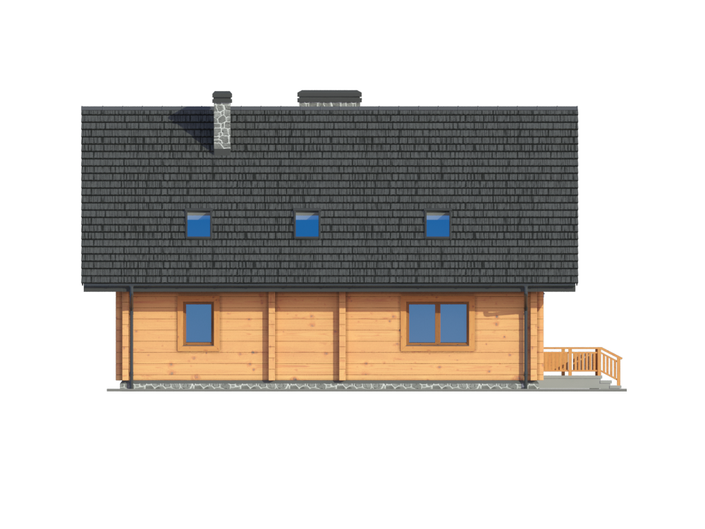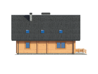 Wysokość ścianki kolankowej: 0.85 m. Strop: drewniany. Pokrycie dachu: dachówka ceramiczna. Ściany zewnętrzne: płazy drewniane + wełna mineralna + deska. Ściany wewnętrzne: płazy drewniane. Typ ogrzewania: kocioł gazowy lub kocioł na paliwo stałe. Inne: okna połaciowe Velux.